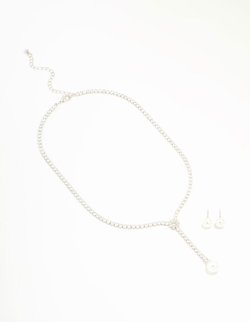 Silver Cubic Zirconia Pearl Y-Necklace & Earrings Set
