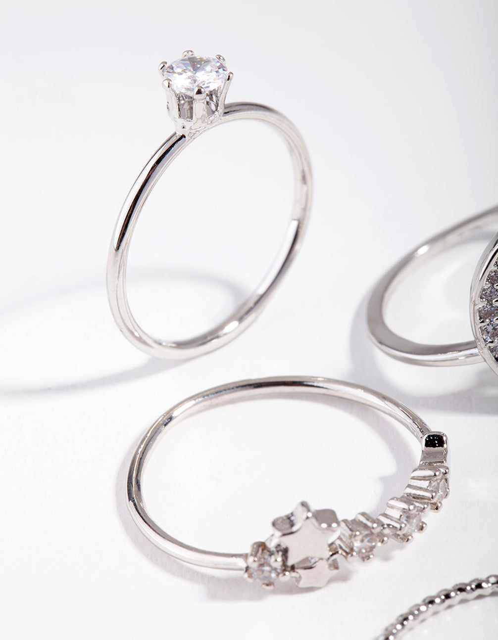 Shine as bright as the night sky with cubic zirconia stones! This exquisite ring set includes five silver-toned rings beset with cubic zirconia stones, which sparkle with the clarity and brilliance of a true diamond. This ring set has a celestial theme, and includes star and moon motifs.