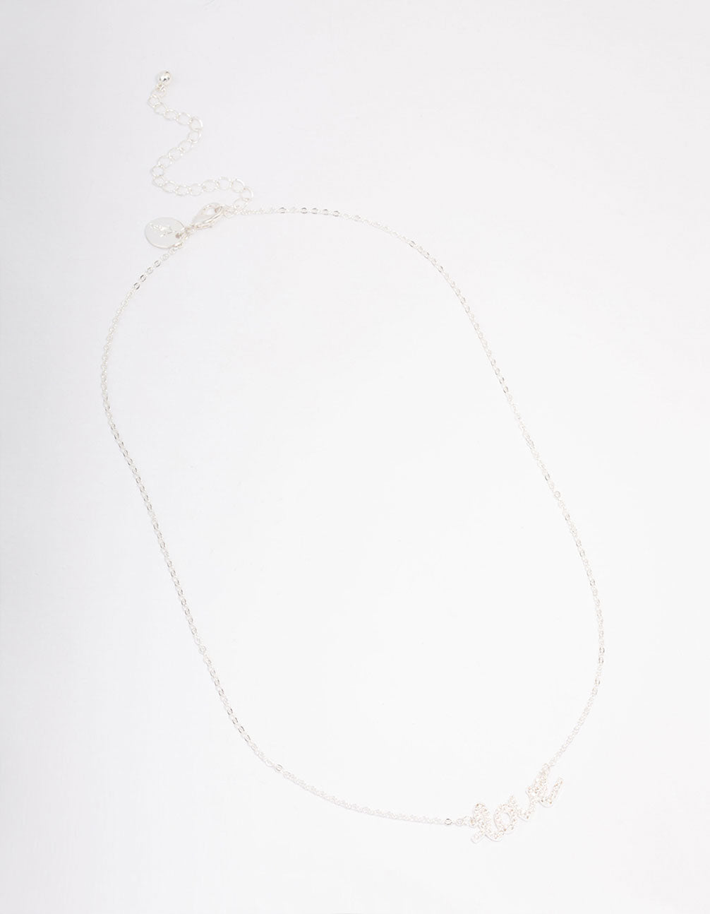 This script pendant necklace features a stunning silver setting that spells the word 'love.' Pair this lovable pendant with a set of matching heart earrings for a complete and enchanting look.