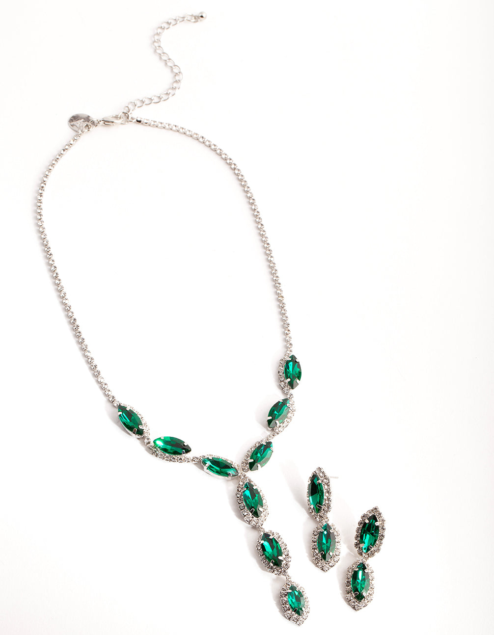 Elevate your ensemble with a statement earrings and necklace pack! This vintage-inspired set includes a diamante-adorned necklace, complete with marquise-cut, faux-emerald stones and a pair of dangling faux emerald drop earrings. Wear them together for a truly refined look.