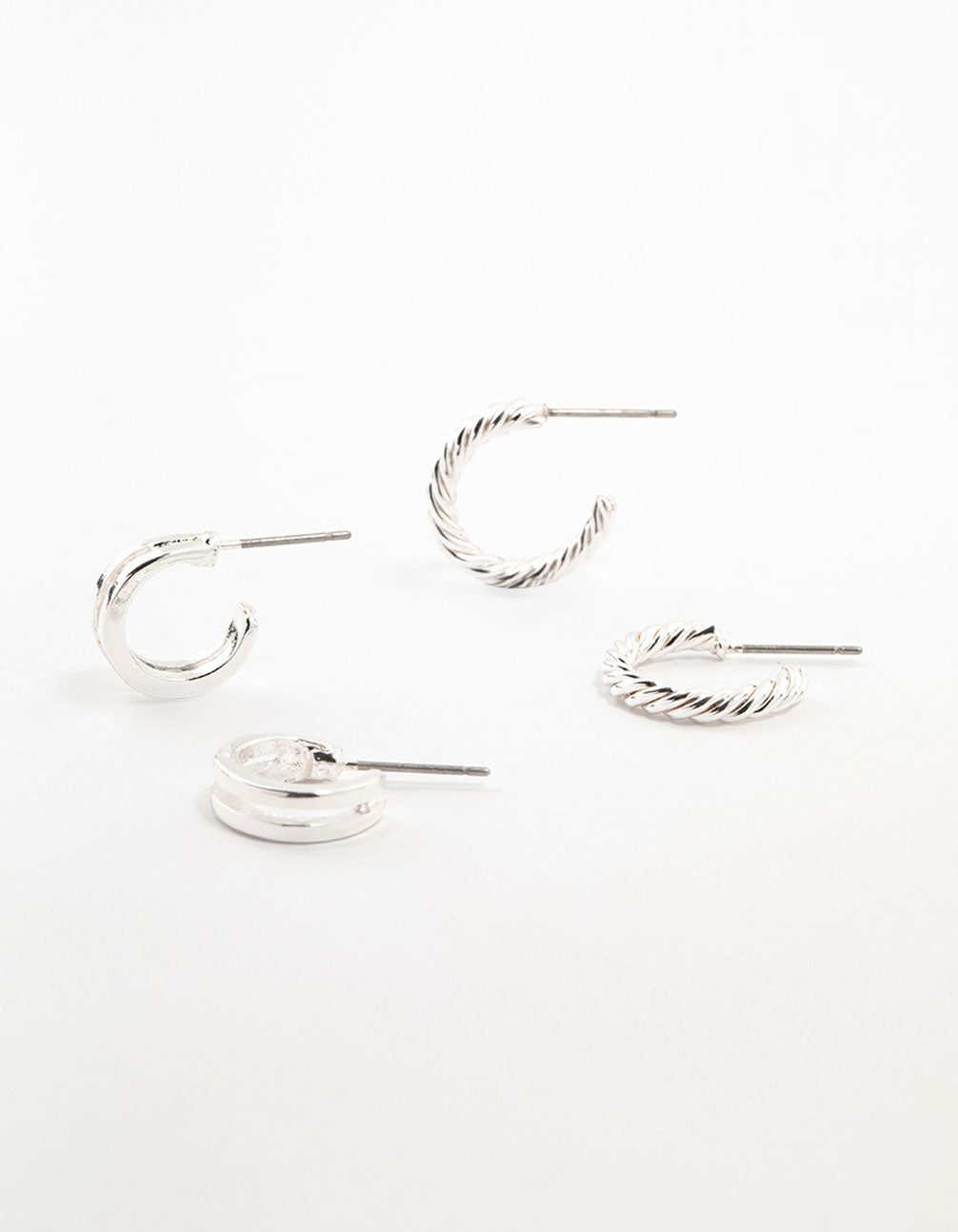 Bring some variety to your stack with this pretty silver toned set. This set features two silver toned hoop earring styles; a double hoop style and a spiral design. This set is perfect for fashion lovers who want hoops with a twist and want to mix and match earring styles for their stack.