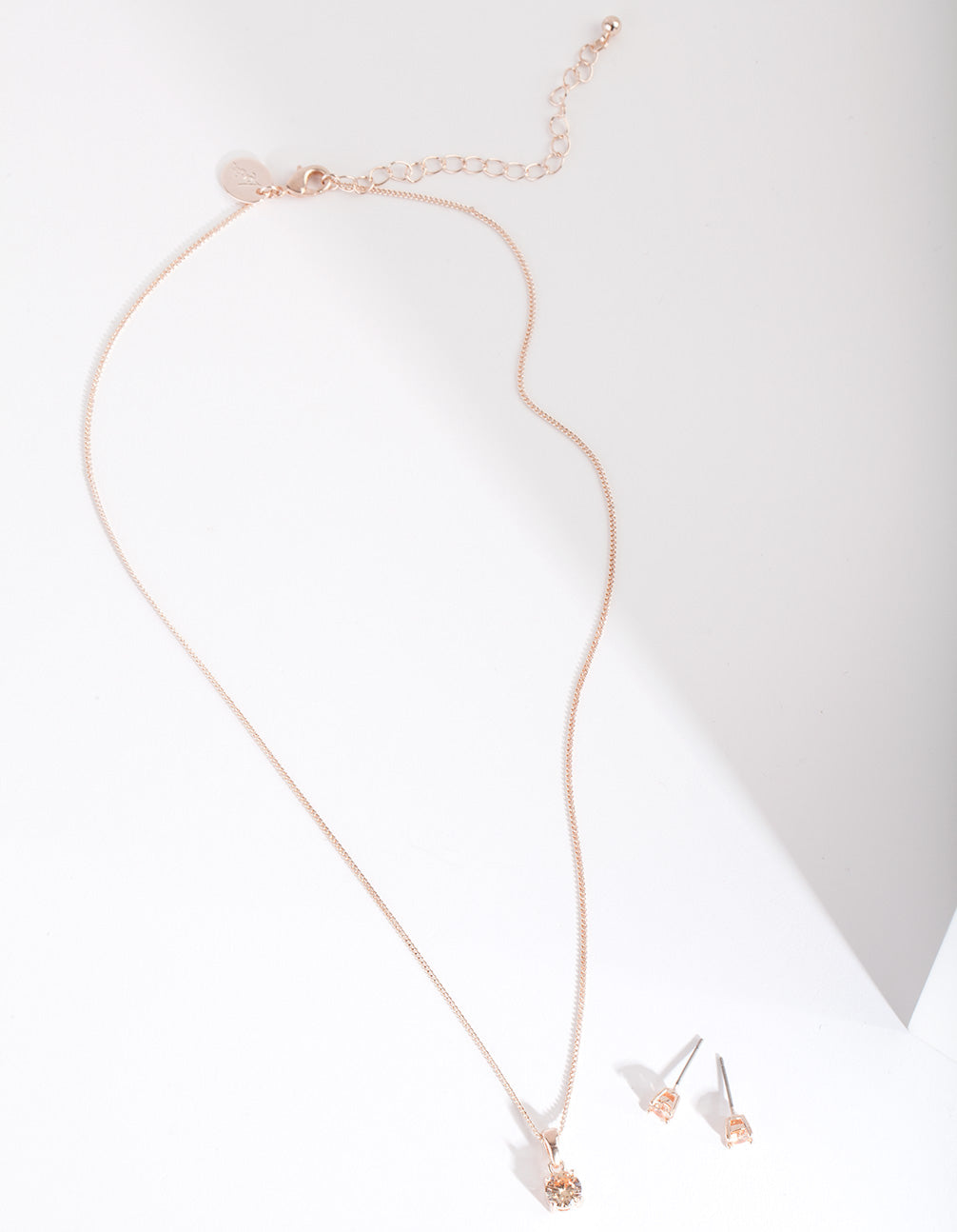 Made with diamond simulants - crystals that are cut to be indistinguishable to the naked eye from a true diamond, this rose gold-tone 6mm silk stone set features stud earrings and a necklace on a fine chain.
