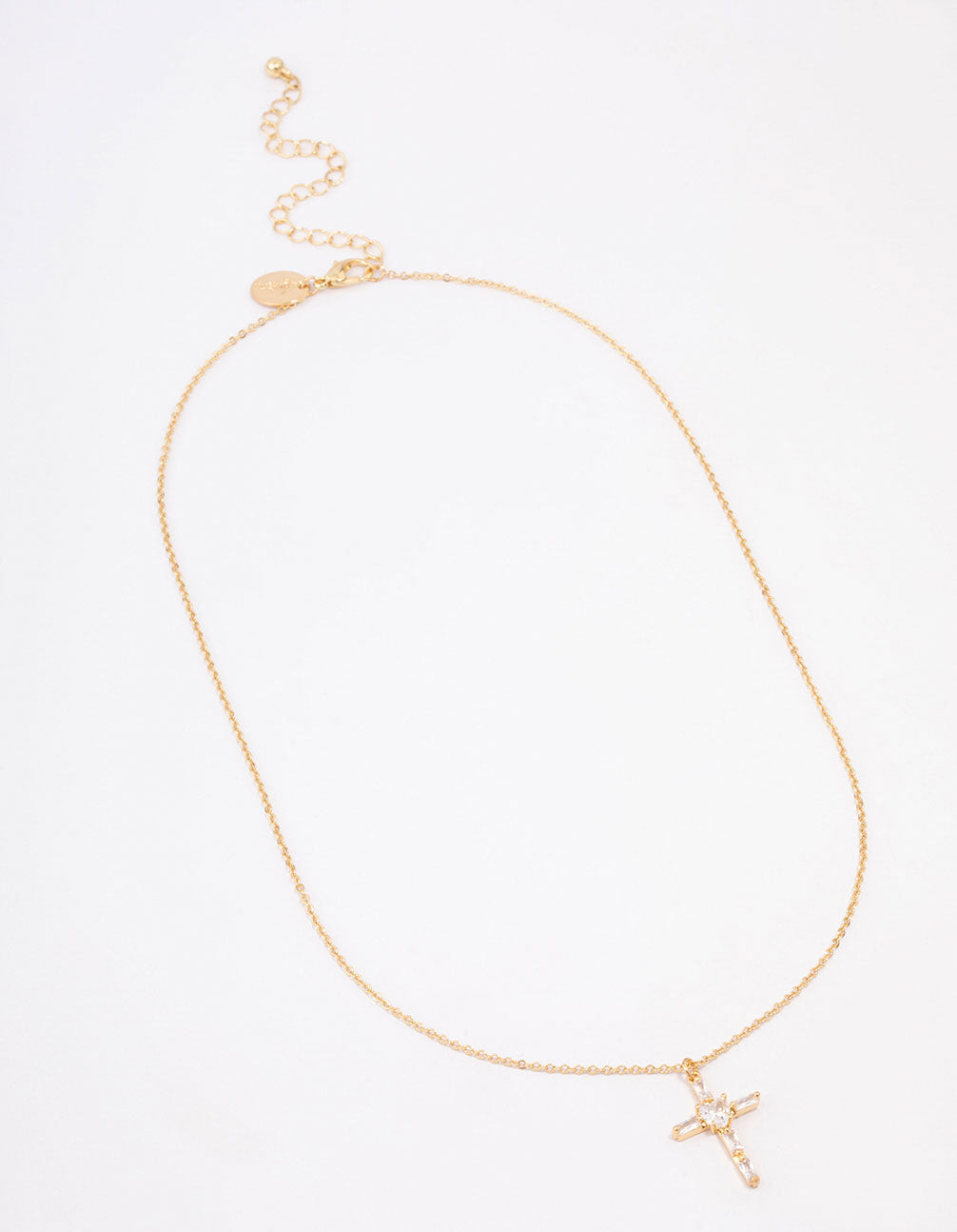 Style this Gold Plated Cubic Zirconia Baguette Cross Short Necklace with a simple pair of baguette earrings for a signature and refined look.