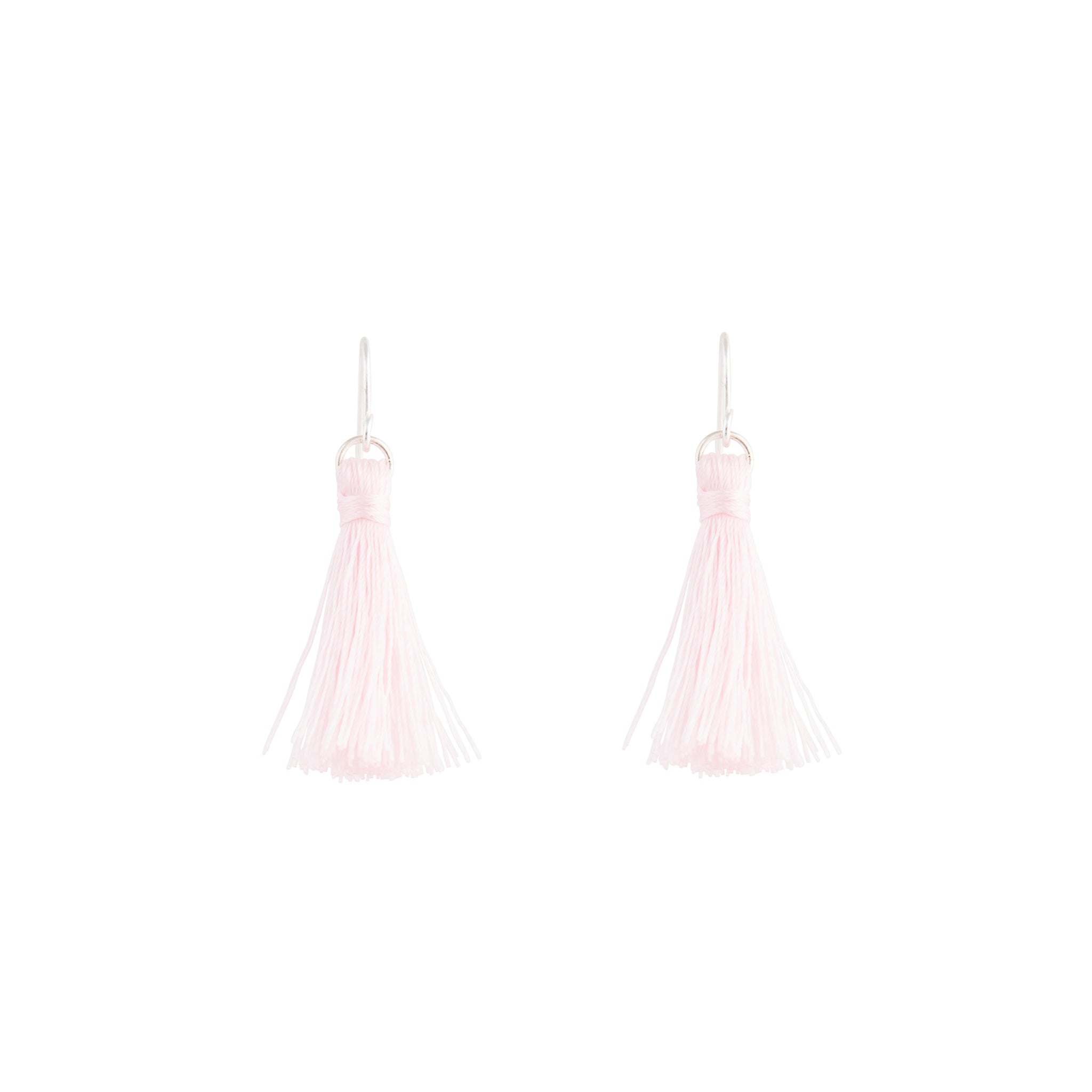 A pair of silver-toned drop earrings featuring a pink tassel.