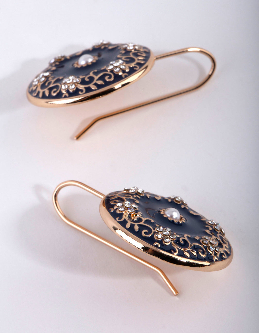 Let out your inner earth child with these funky drops! They're gold toned with a navy enamel centre that boasts an ornate floral pattern. They're studded with diamantes and faux pearls to add a little shine. Wear them with bold colours or lace for a free-spirited look.