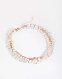 Invest in soft, pretty pieces that can be worn with daytime or evening ensembles. This beautiful necklace is comprised of multiple layers, which creates the illuison of wearing several necklaces. A chunky rose-gold-toned chain sits with two rows of faux pearls, each with different pearl shape. So pretty! Wear it with blush and white for a luxury look.