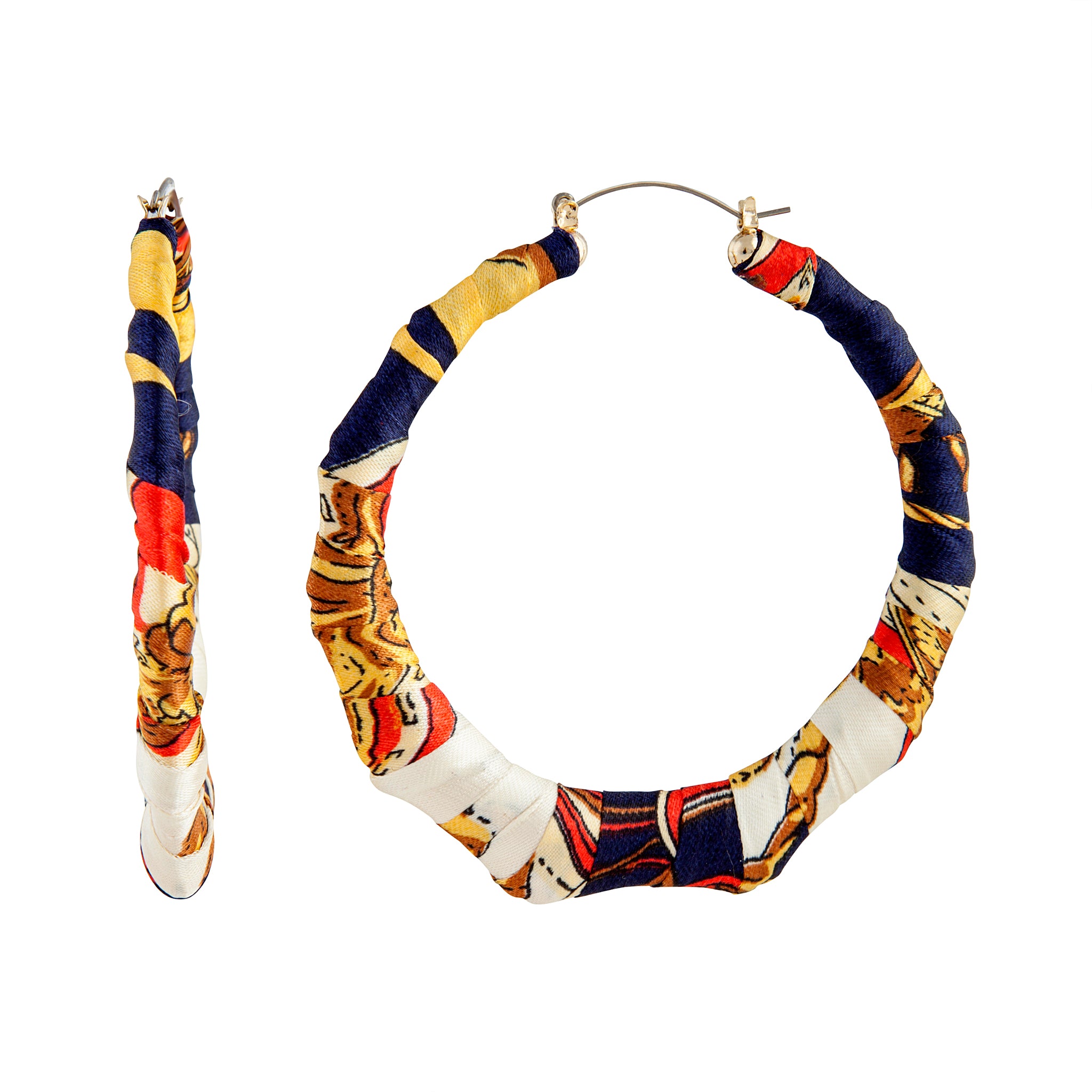 These high fashion statement hoops give off a nautical vibe with gold, red, white and blue tones. The bamboo shape is wrapped with the printed satin fabric to give them a luxorious look.