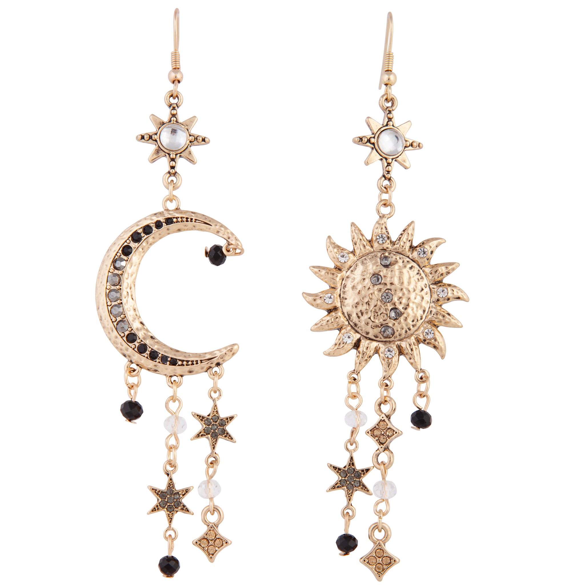Find some magic in the everlasting celestial trend. A pair of antique-gold-toned mismatched earrings with a sun & moon black diamante design. Match with other antique and semi-precious elements for a dreamy Victorian aesthetic.