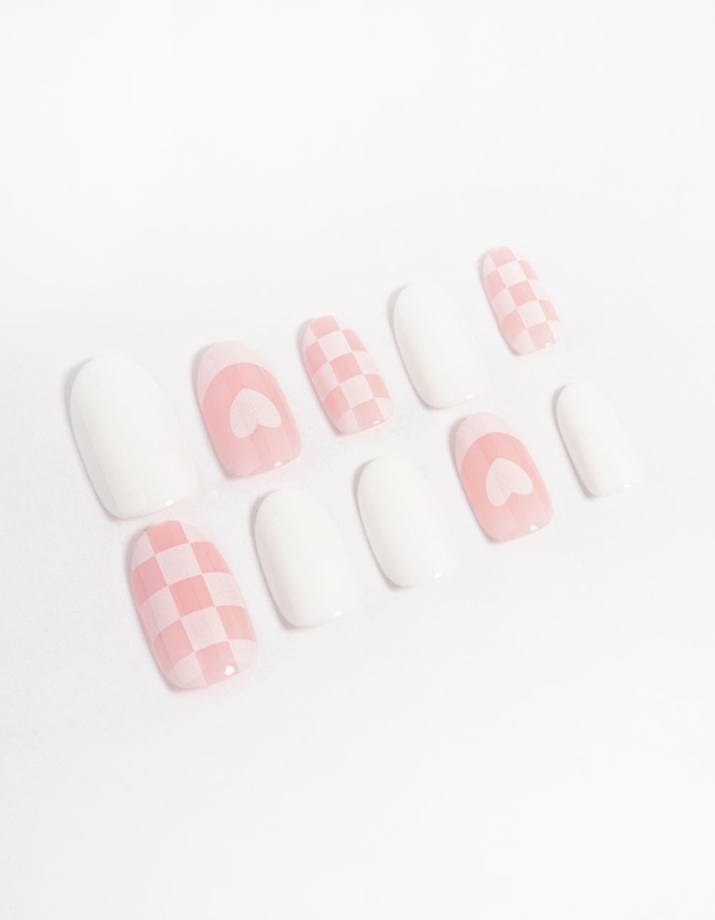 Style these oval-shaped checker nails with an adorning ring stack for an on-trend look.