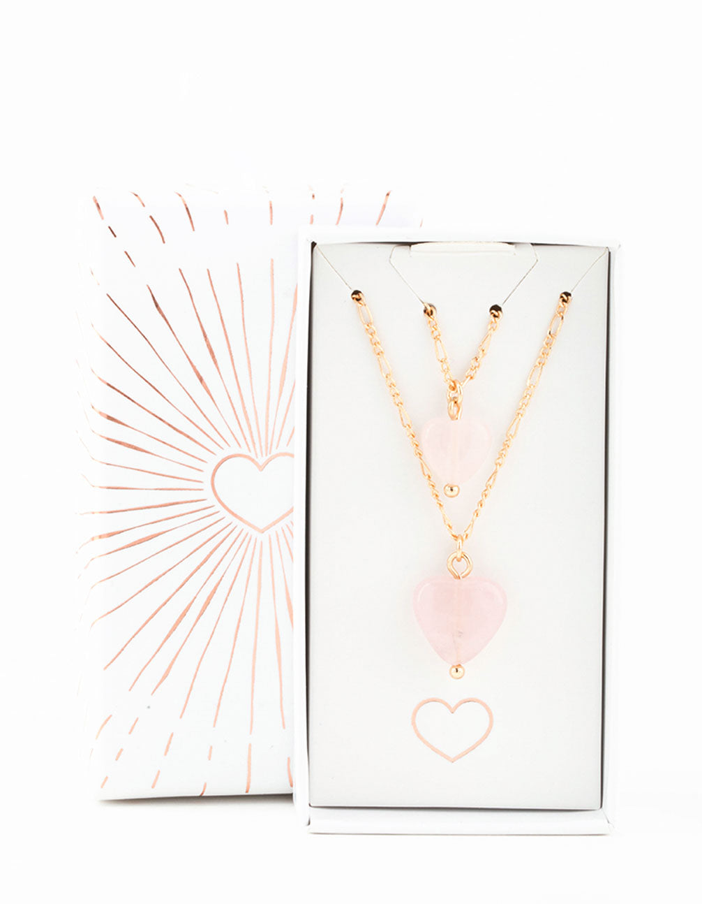 This gift box contains two semi-precious pendant necklaces, featuring an opal and rose quartz heart charm.