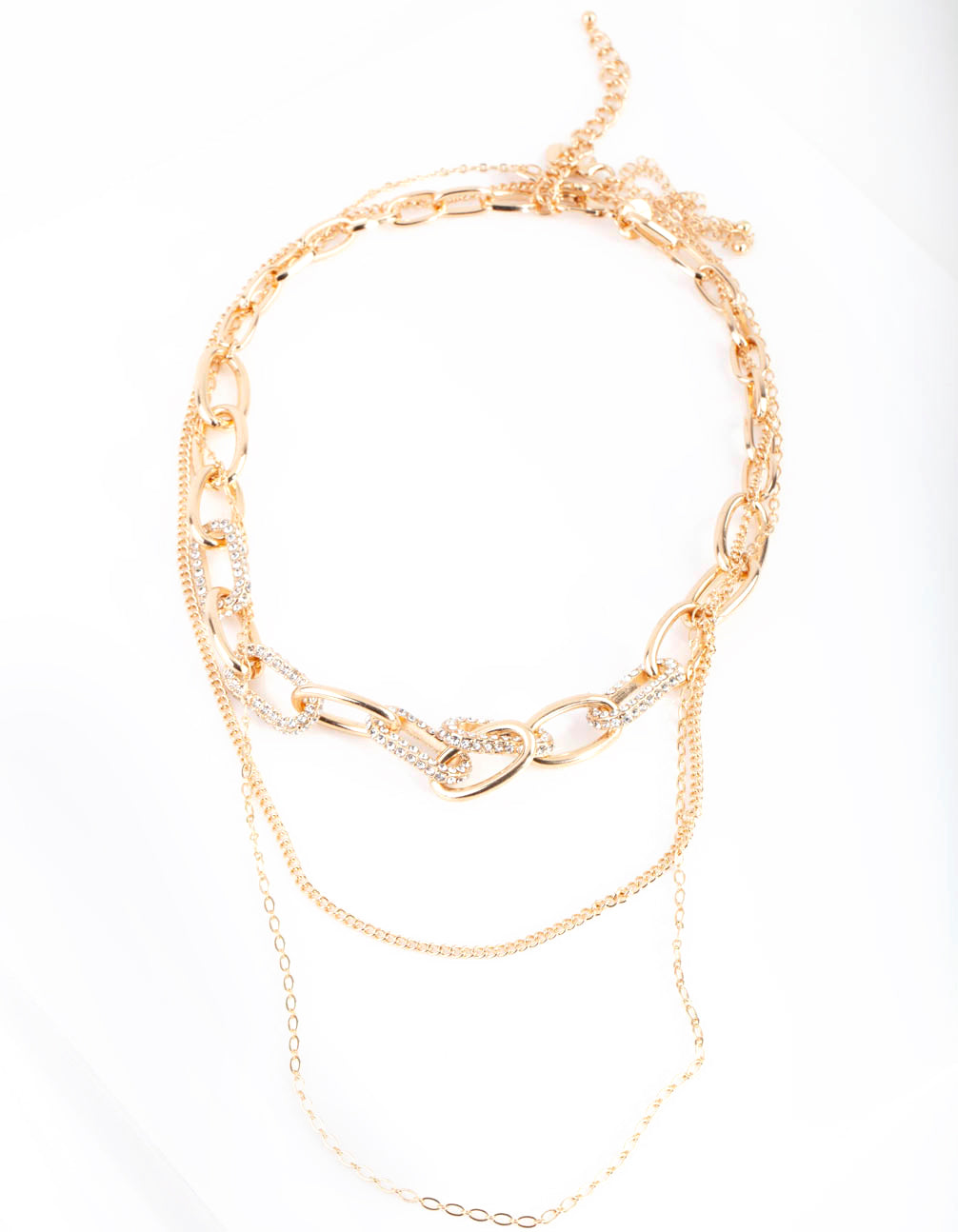 There's no better way to elevate your outfit than by layering it up with one of our multirow necklaces! This gold-toned necklace features 3 stunning diamante link and chain designs.