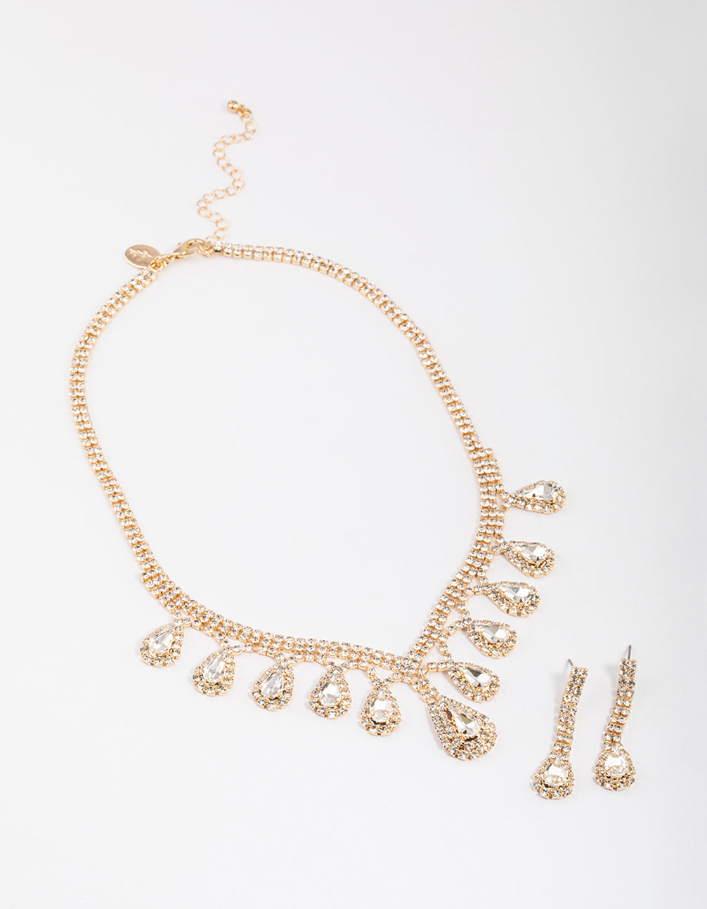 Gold Diamante Surrounded Teardrop Earrings & Necklace Set