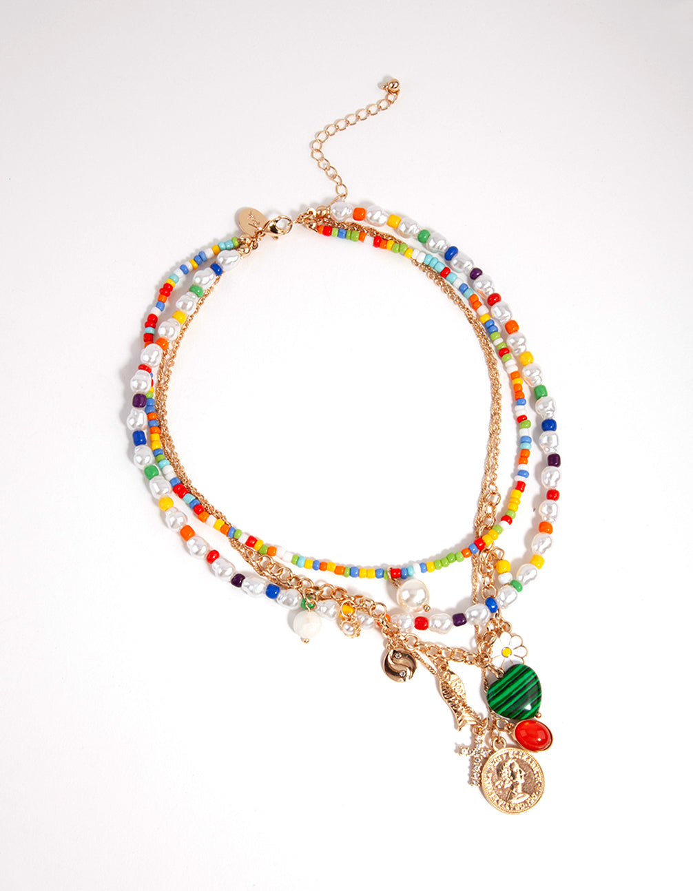 Embrace 90s trends with this vibrant Rainbow Layered Necklace. It boasts four chain layers that are embellished with colourful beads, faux pearls and a variety of gold-toned and enamel charms. Wear it for a casual brunch, to go shopping with friends, or even for a trip to the beach! The charms include an emerald love heart as the statement piece, a red oval pendant, an enamel daisy, a gold-toned coin and fish and a diamante-studded cross and yin-yang symbol.