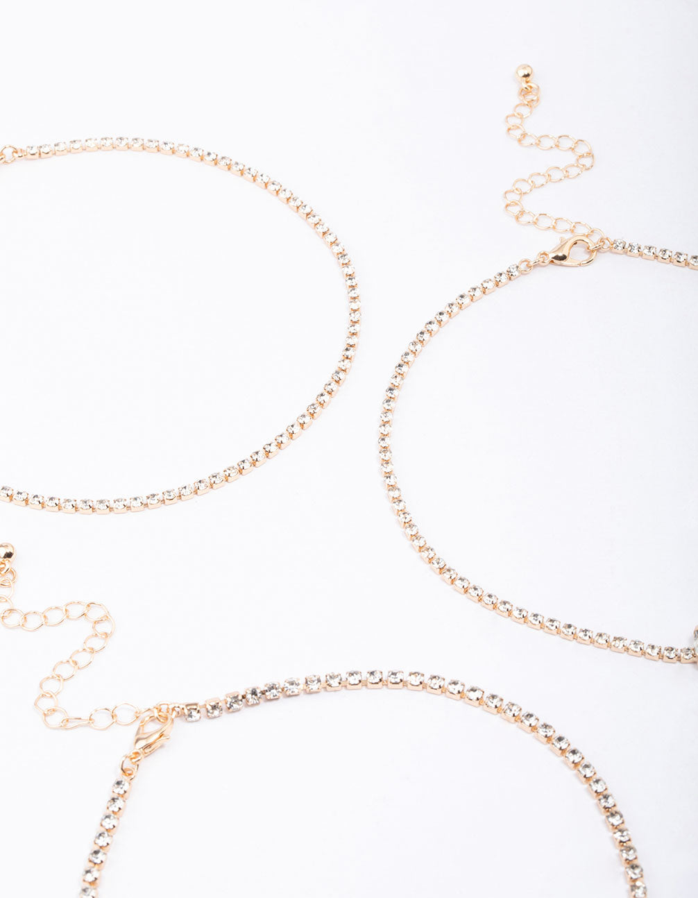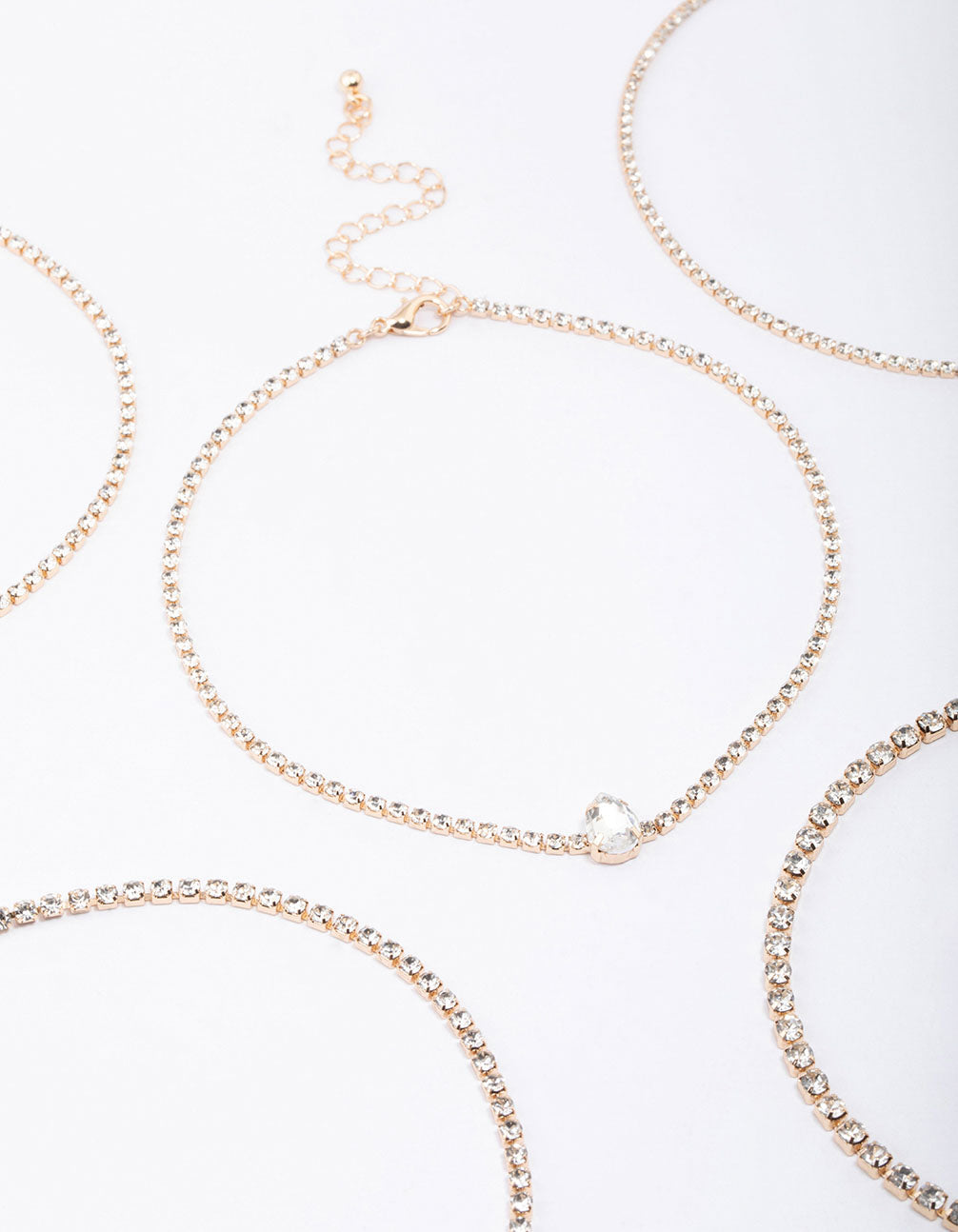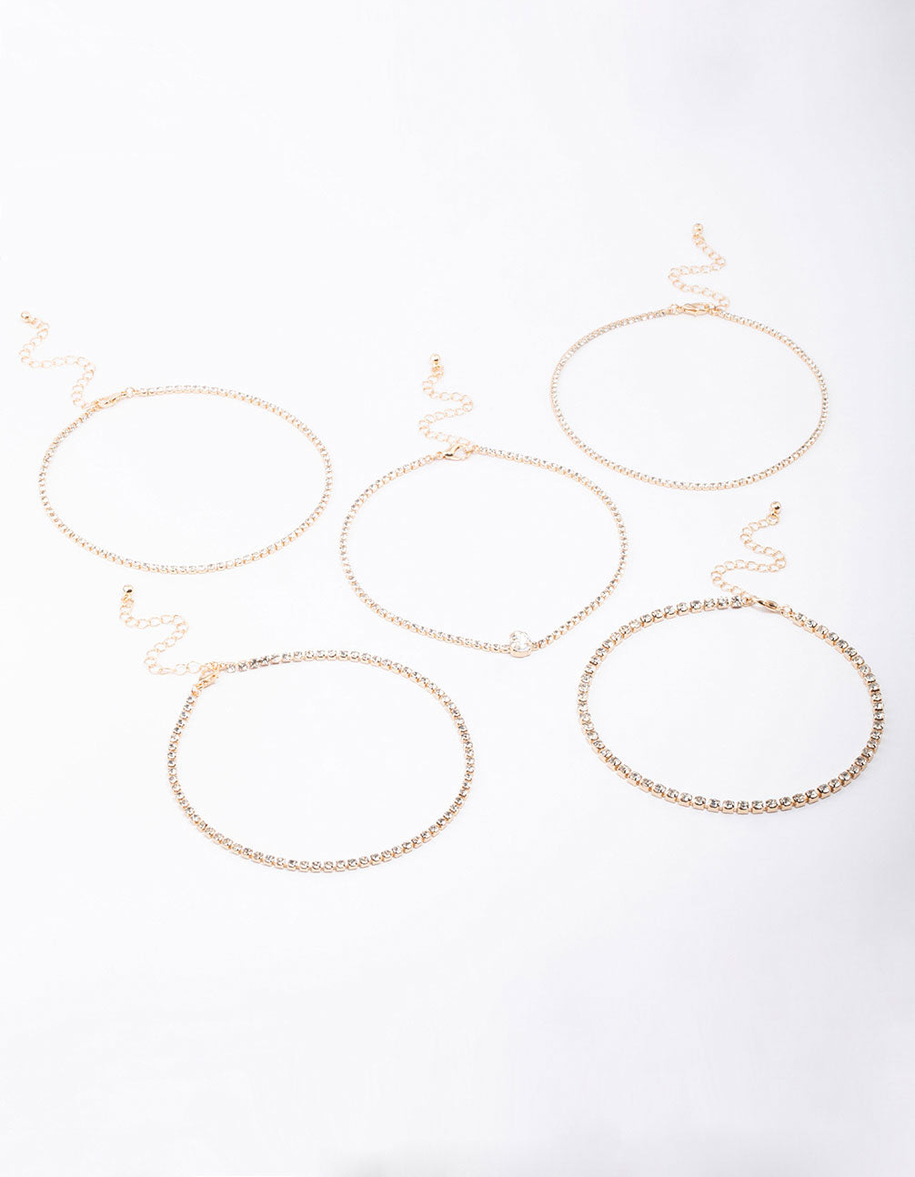 - This choker necklace pack contains five individual gold-toned choker necklaces with round and pear-shaped accents.