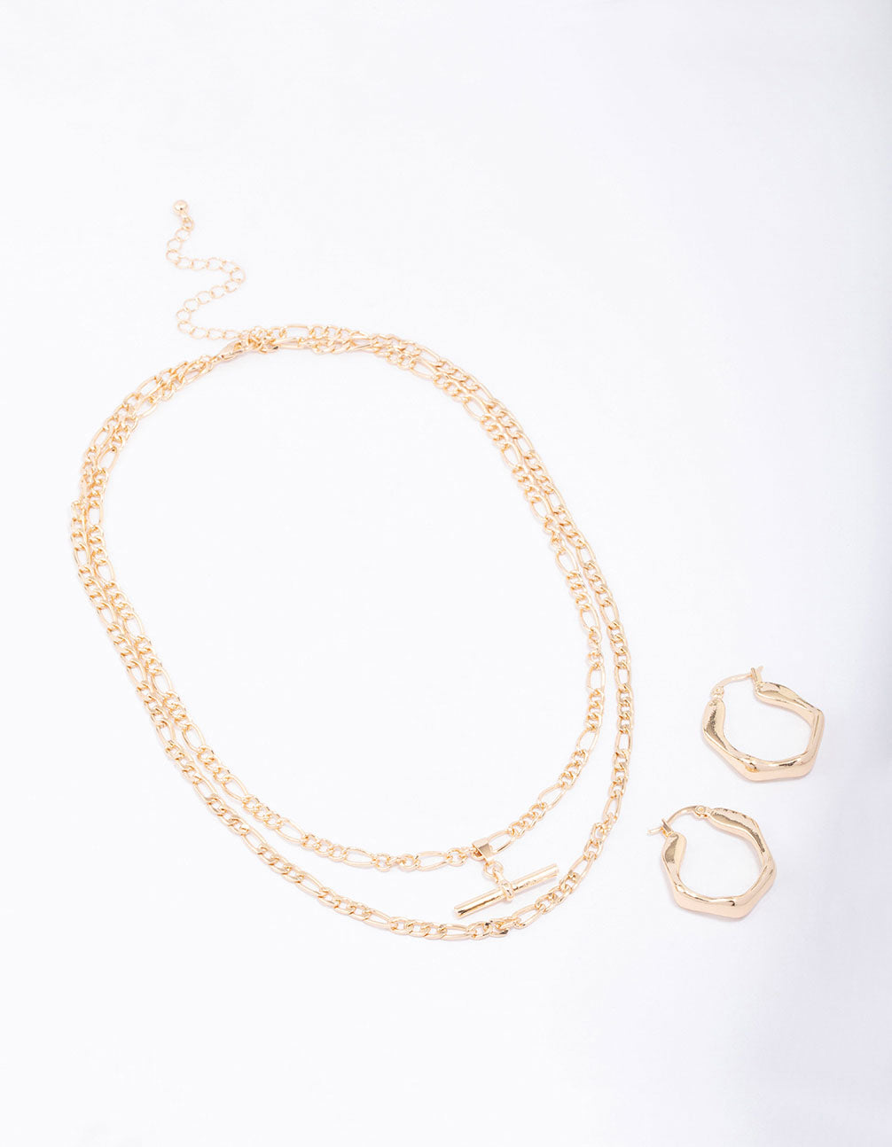 - This classic jewellery set contains a gorgeous, gold-toned toggle necklace and pair of timeless earrings to match.