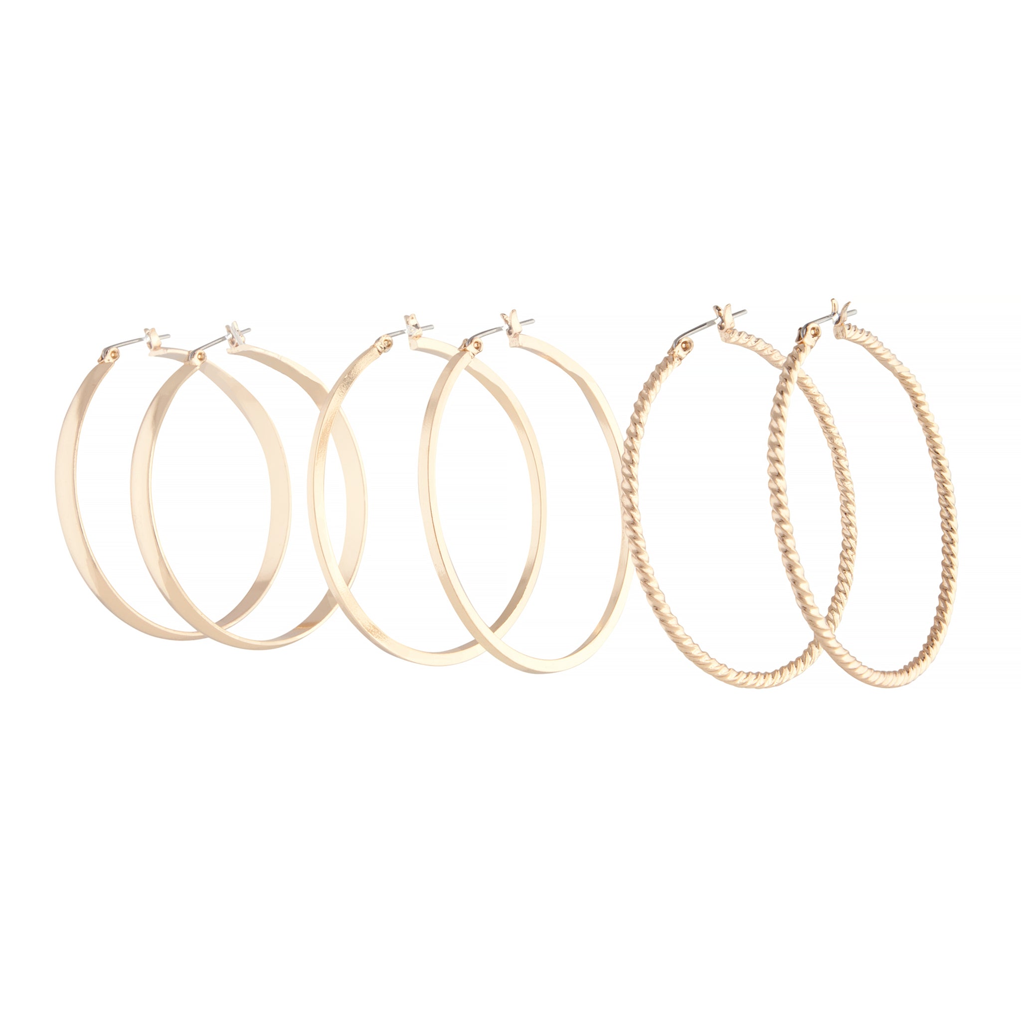 Cover all bases with this set of gold toned hoop earrings. The trio contains a variety of styles to suit your mood.