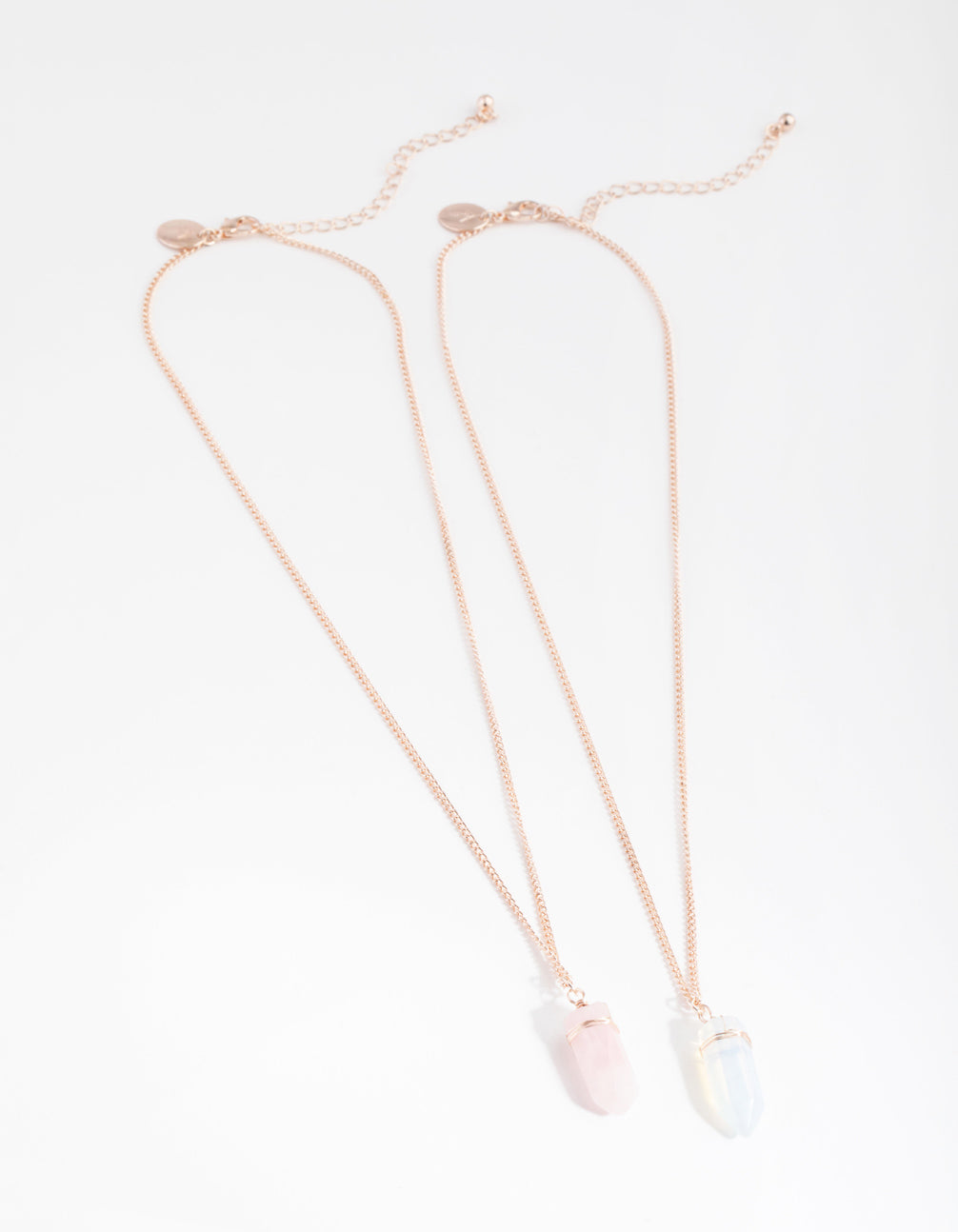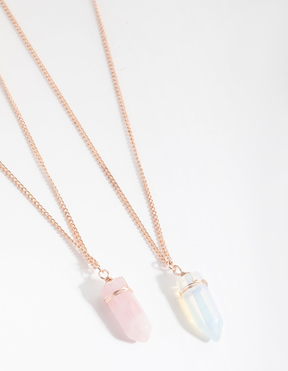 Gift a friend or treat yourself with this necklace set! It features two rose-gold necklaces, which both feature a shard pendant. The elements included are rose quartz and moonstone, which are believed to encourage caring and commitment.