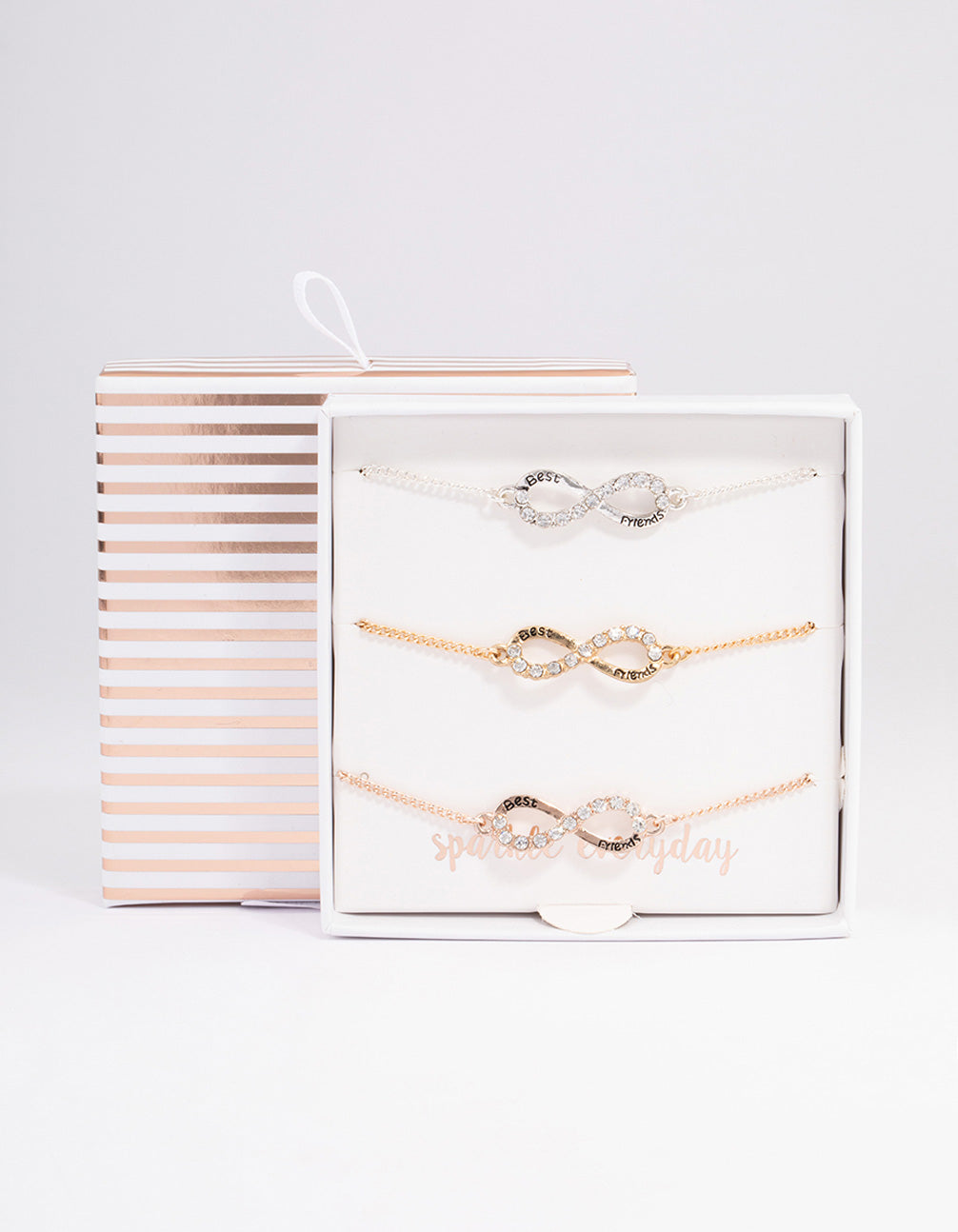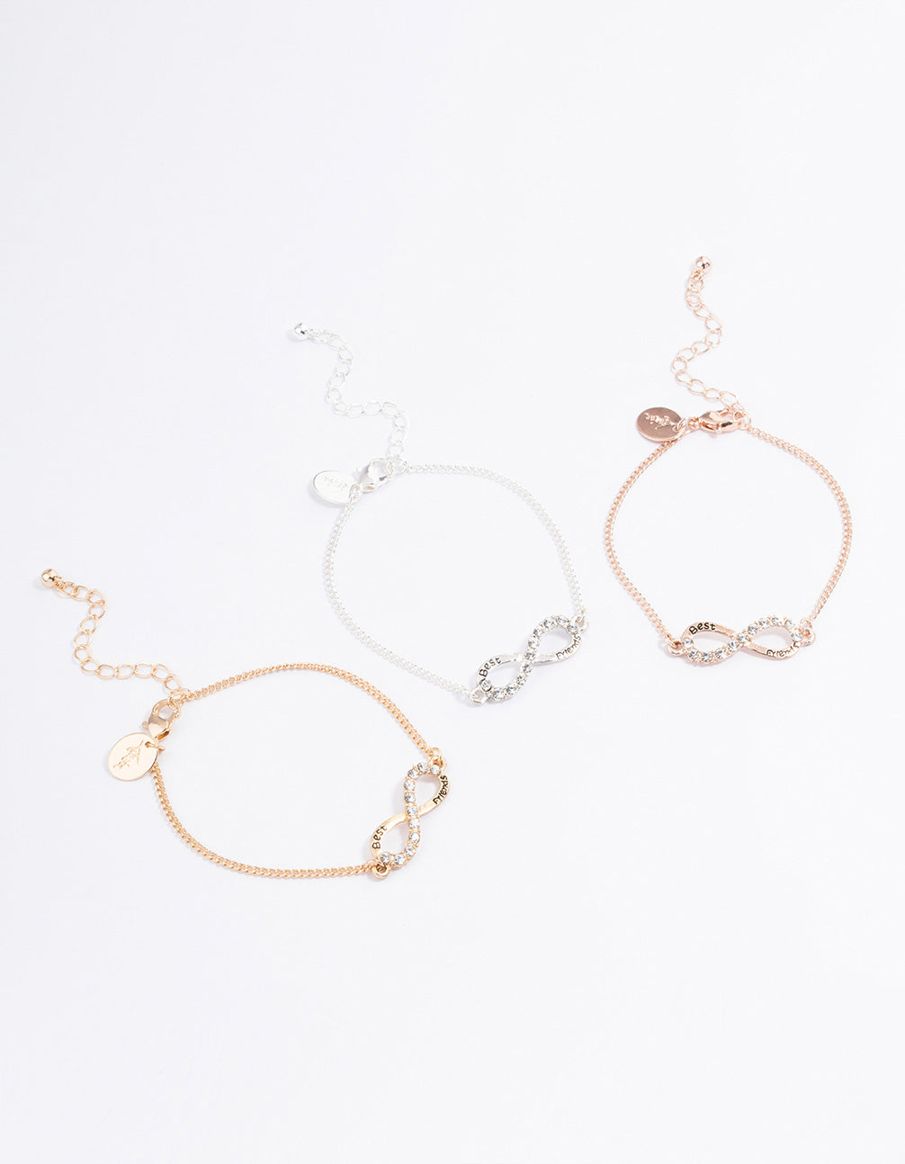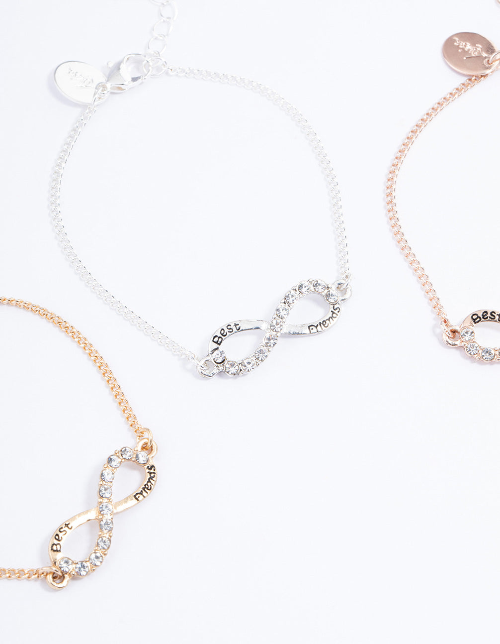 This trio of bracelets come with a diamante encrusted infinity design. Gold, rose gold and silver tones make up this set. The phrase "best friends" is written on the front, making this set perfect for gift-giving.
