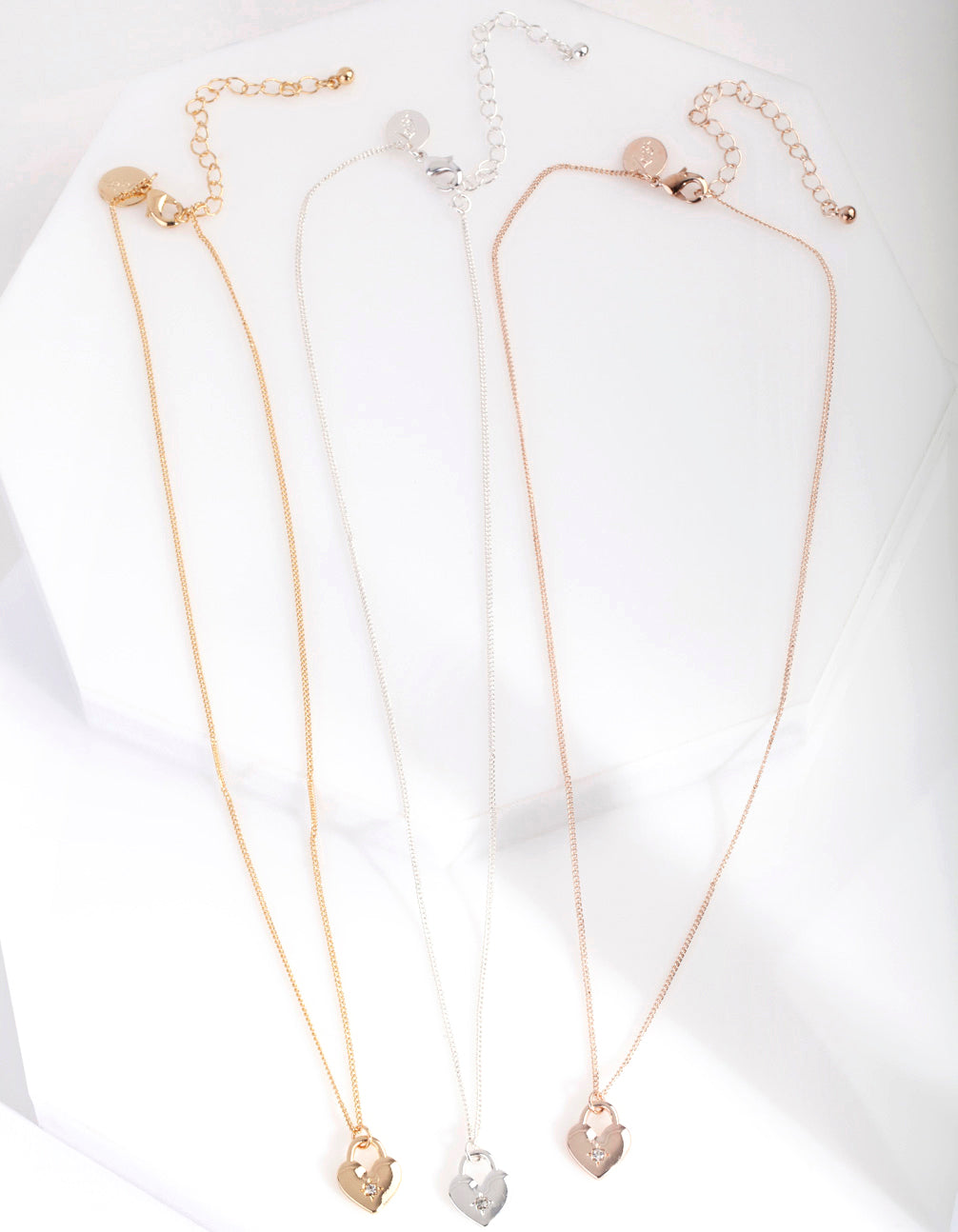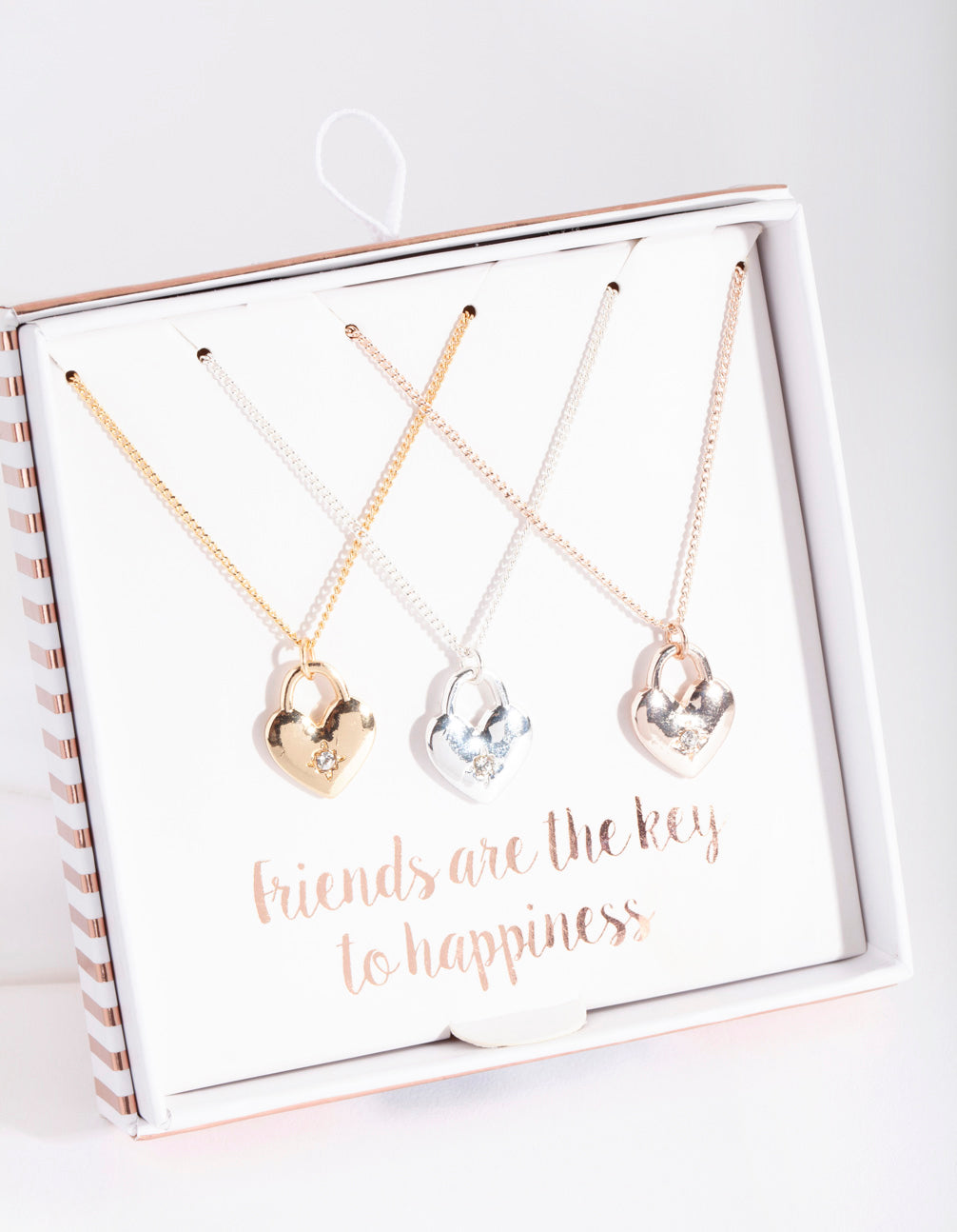 Shareable, giftable and packed in pretty packaging. Lovisa gift-boxes take the stress out of gift giving. This gift box comes with three mixed metal heart lock necklaces featuring a small diamante.