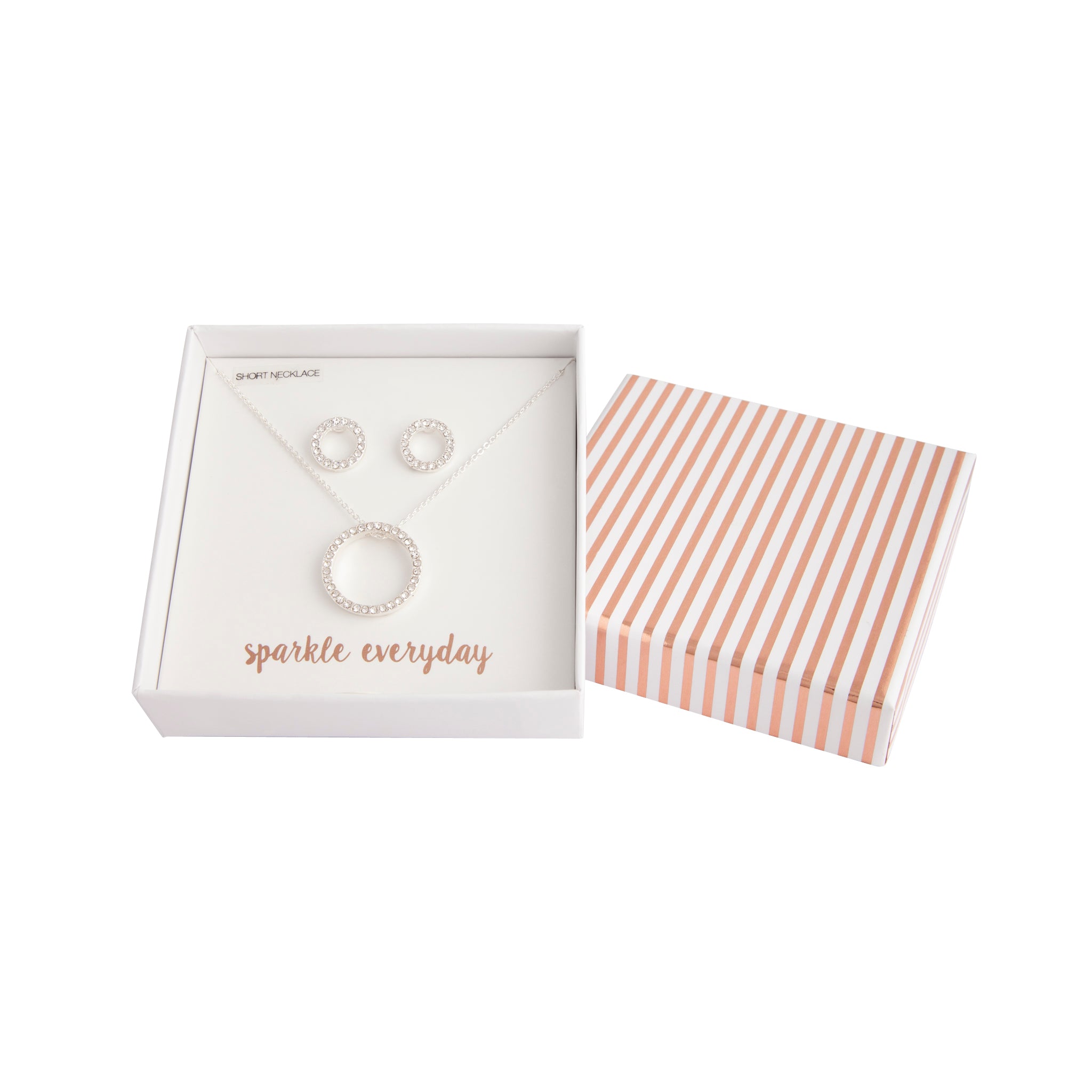 This jewellery set is perfect for gift giving. It comes with a silver-toned chain necklace and earrings with an open circle design. The phrase "sparkle everyday" is written on the box.