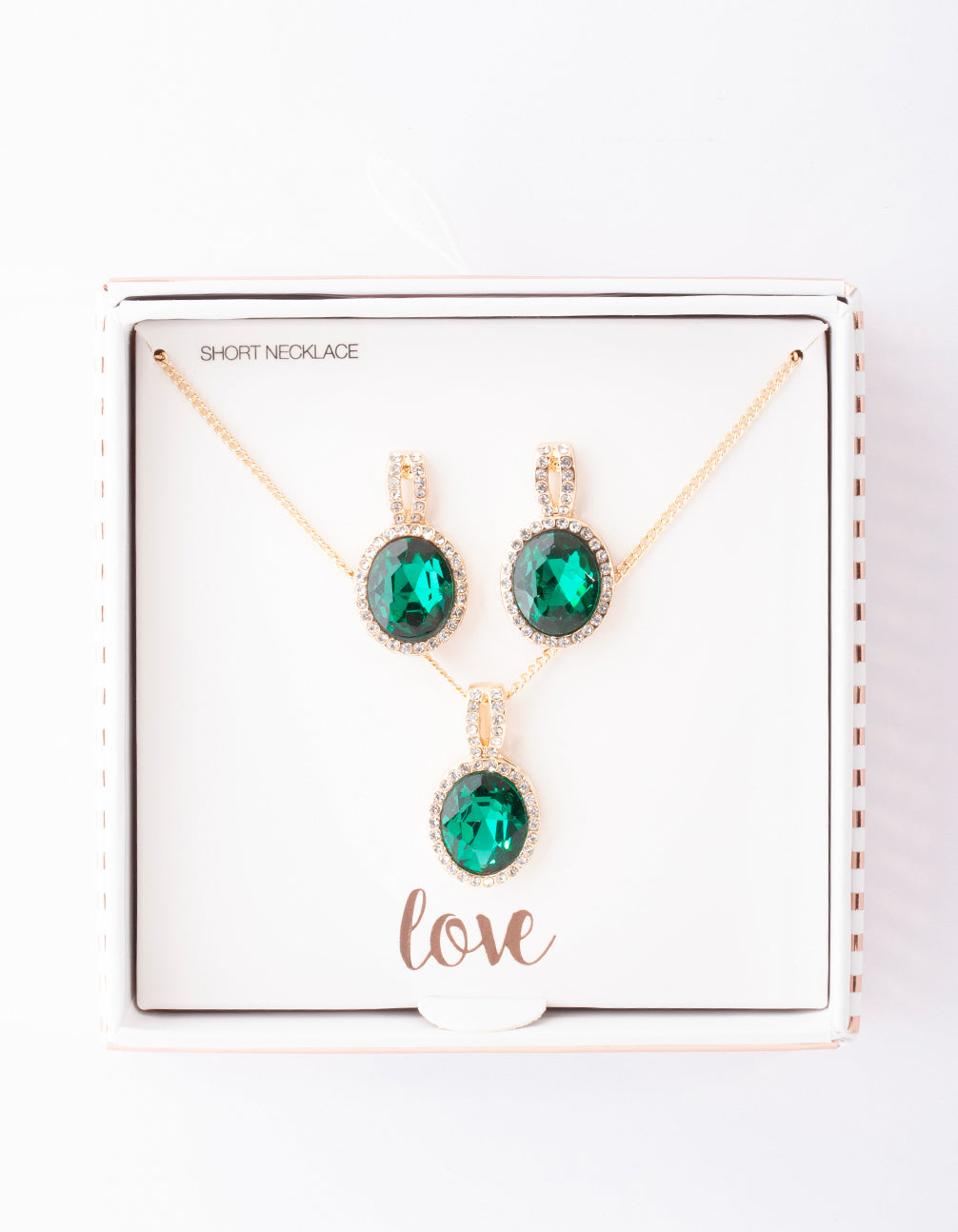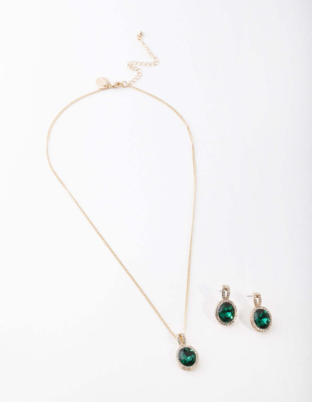 Finding the perfect gift for an accessory lover has never been so easy! This gold-toned necklace and earring set features a stunning green halo design and is perfect for that special someone!
