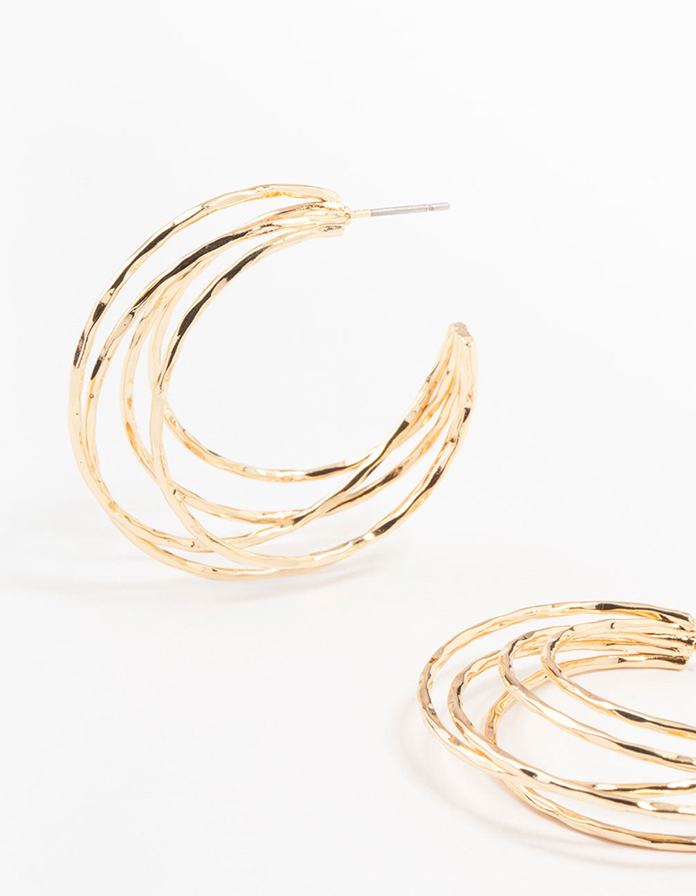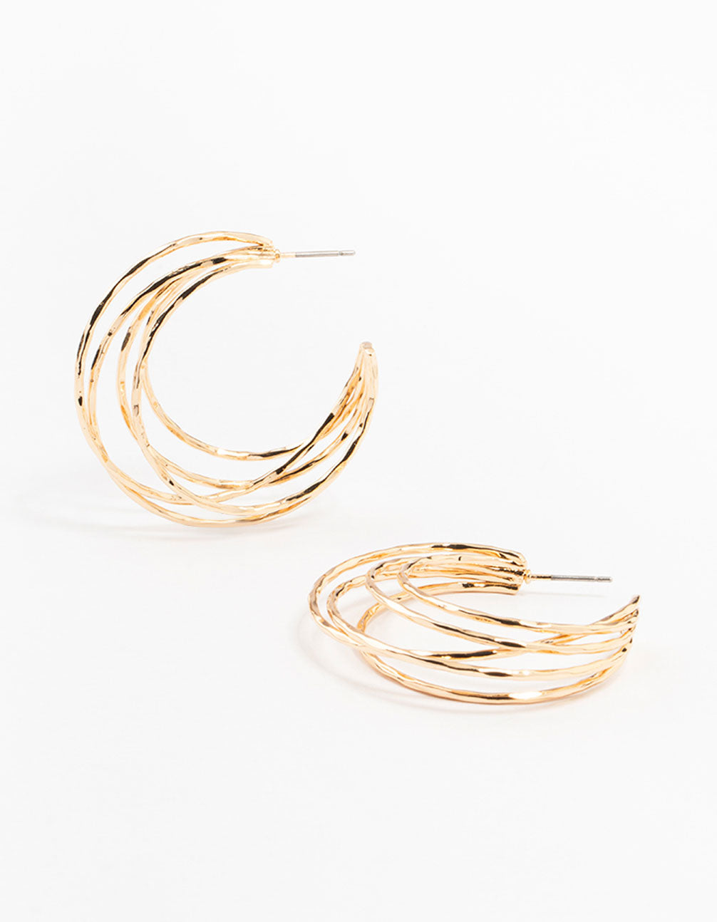 Elevate your look with these gleaming gold 3-row hoop earrings—a chic, versatile accessory with sophisticated shine and eye-catching dimension. Pair them with anything from a power suit to a little black dress for an instantly polished finish.