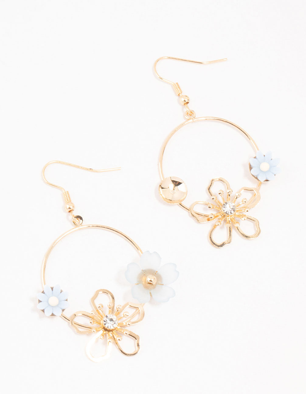 Add garden chic to your look with these drop earrings. Featuring a circle of blue acrylic and gold flowers, they're a mini floral burst for your ears. Perfect for a touch of elegant, blooming fun.