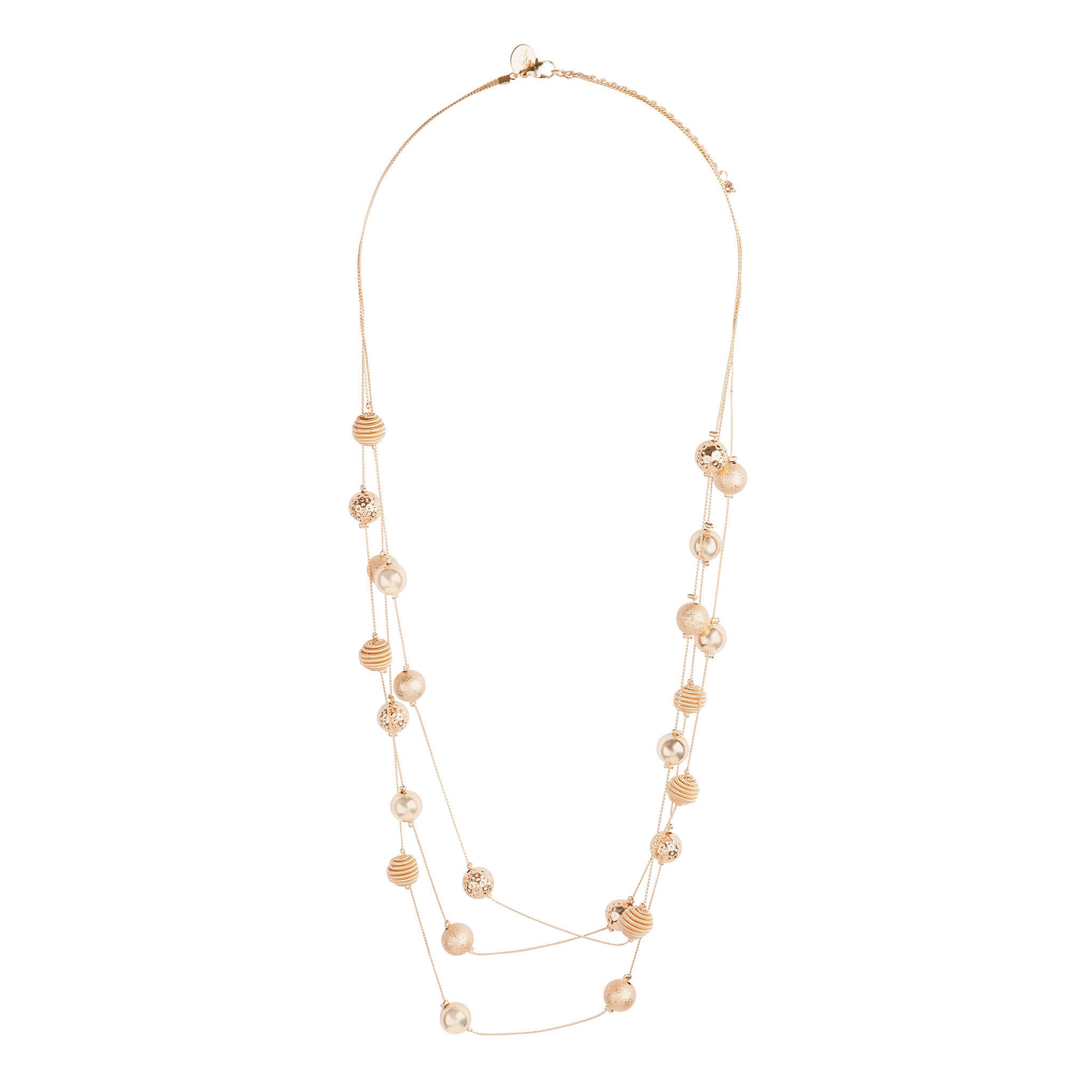 Its party season with this layered gold tone necklace! Featuring a trio of textured metal beads delicatedly sprinkled across three chains.