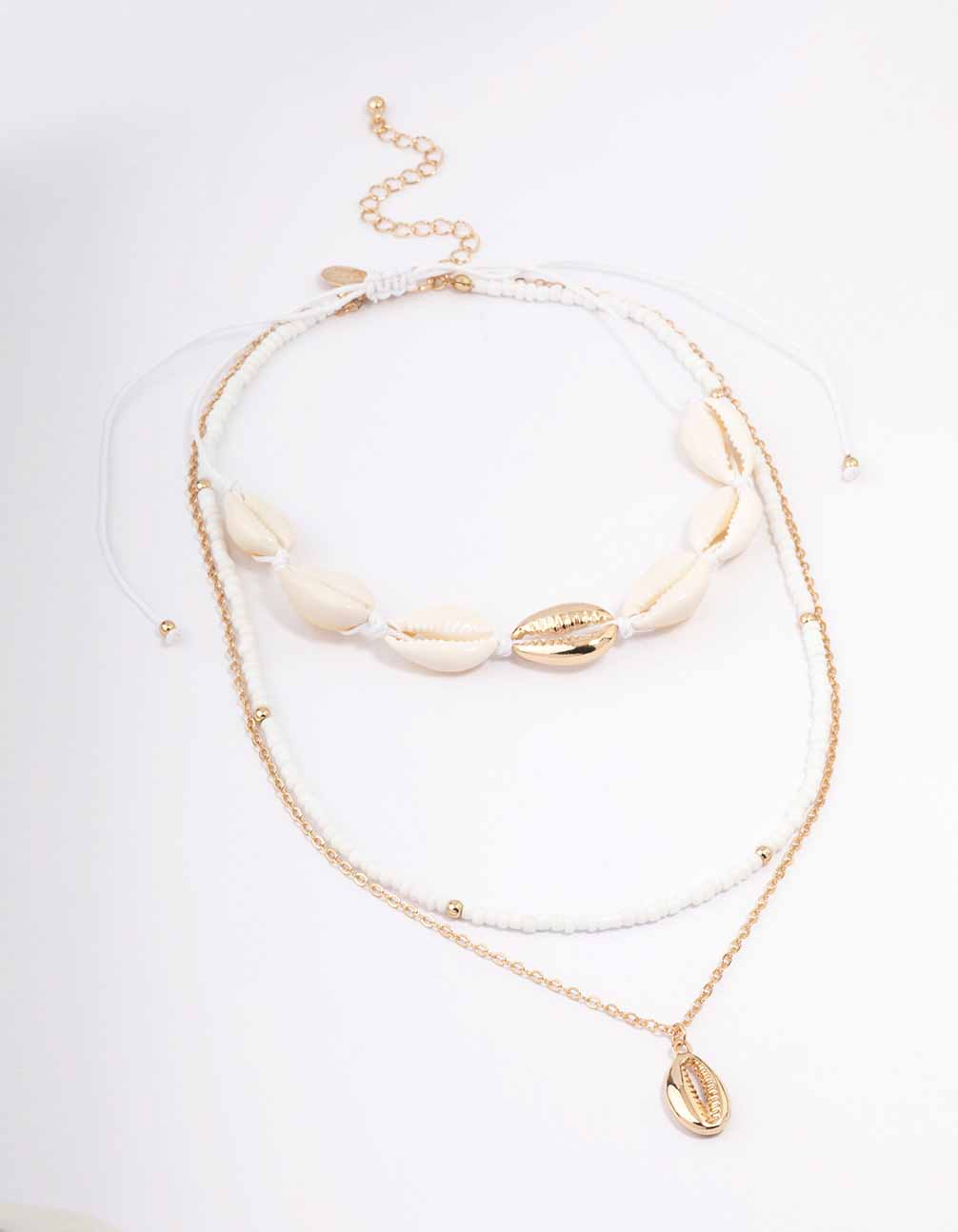 Style this Gold Beaded Shell Layered Necklace for a multi-dimensional, summery finish to your outfit.