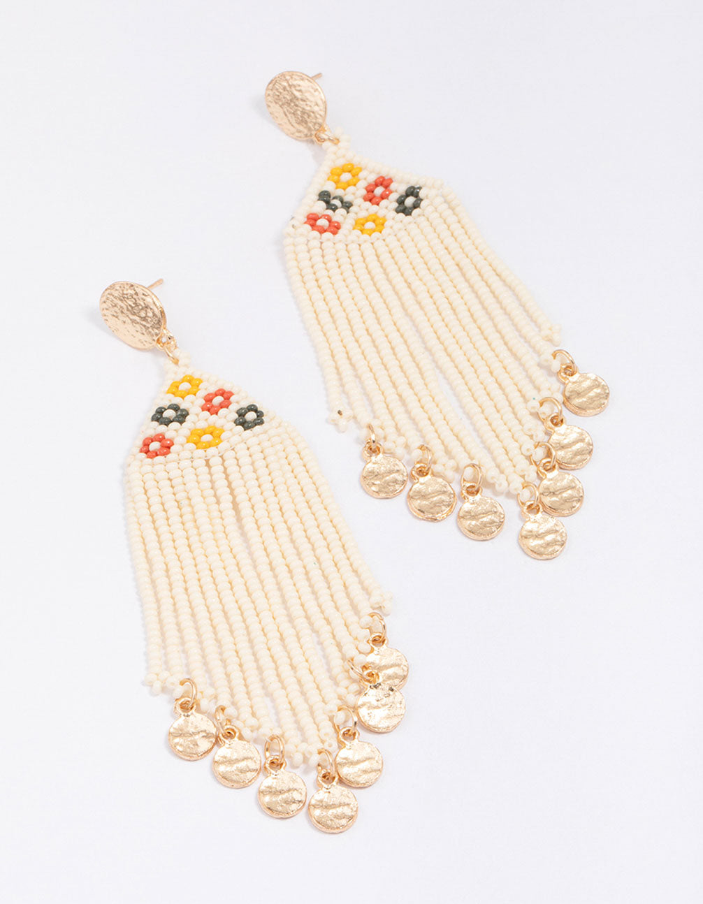 Make a statement with these gorgeous, gold-toned drop earrings. These unique statement earrings feature a collection of cream-coloured beads, designed to give your look a boho touch. Perfect for styling at your next festival!