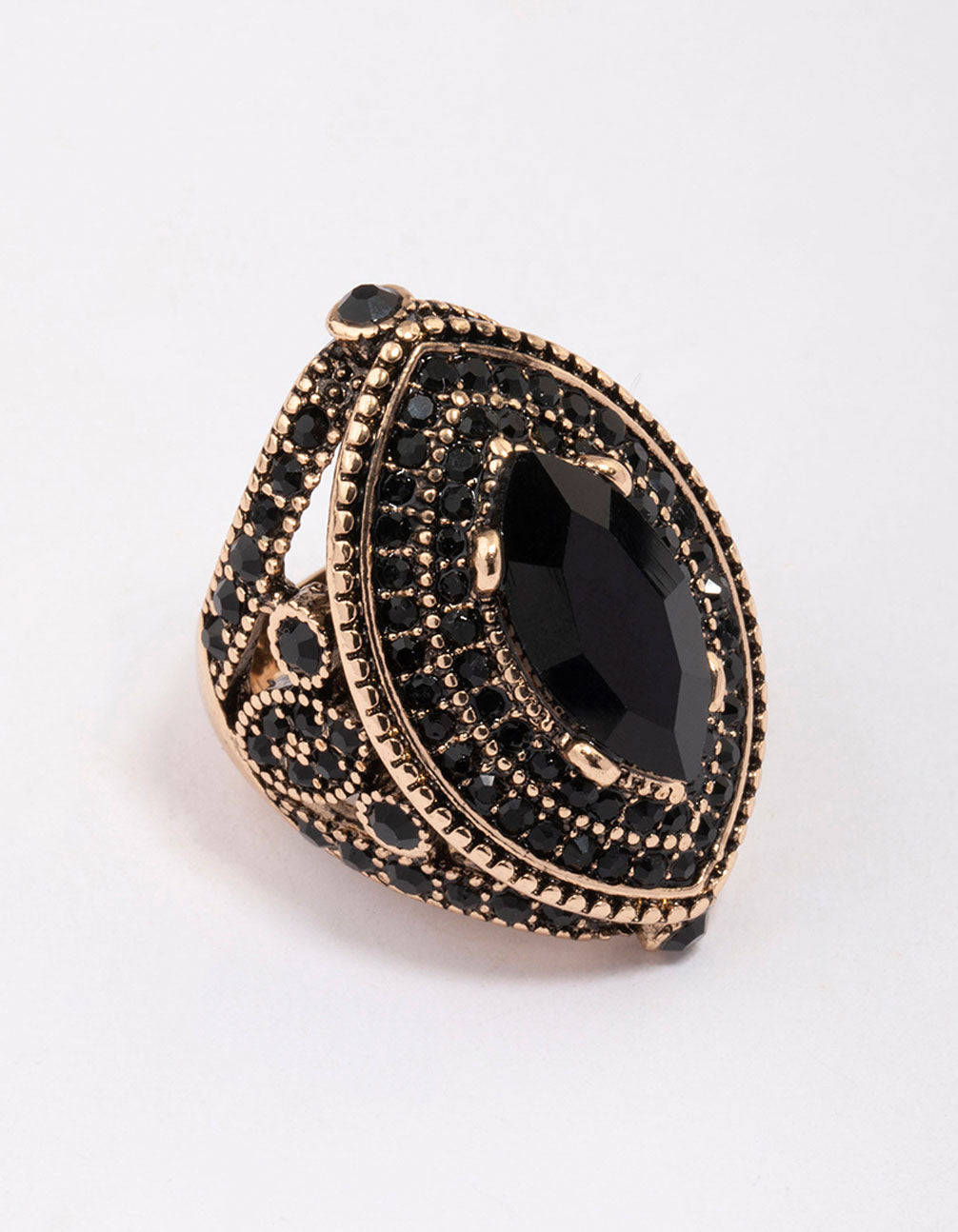 For a captivating touch to your stack, style this gold-toned cocktail ring. This statement ring features a pear-shaped design, adorned with black crystals for a boho-inspired finish.