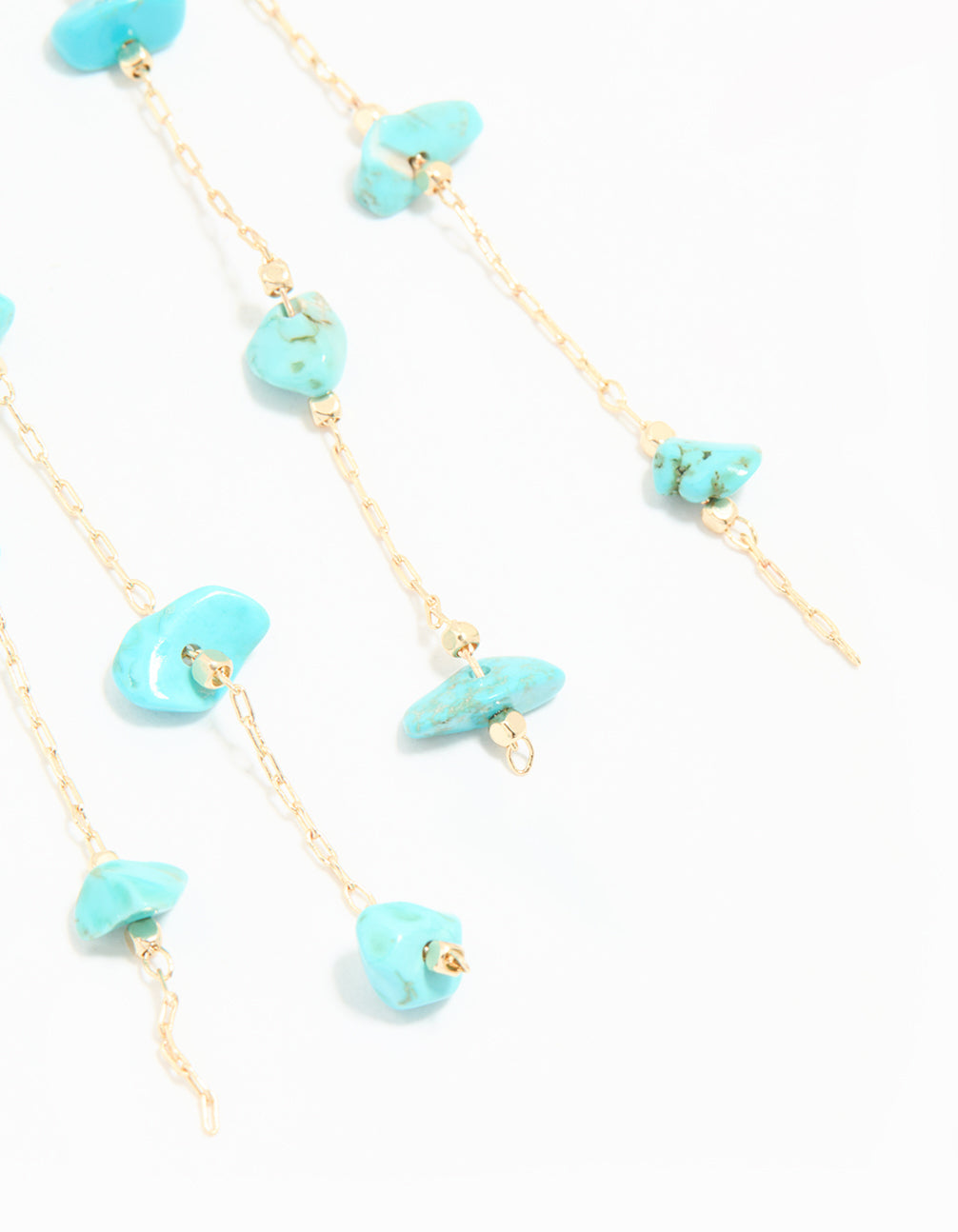 Add a pop of colour and elegance to your look with these Gold Blue Semi Precious Stone Statement Chain Drop Earrings. Featuring gorgeous turquoise semi-precious blue stones (associated with good luck, protection and well being) set in a gold-tone chain design, these drop earrings are perfect for those who love bold, statement jewellery. The sleek chain detail adds movement and a modern edge, making them ideal for dressing up casual outfits or complementing formal wear. Whether you're heading to a dinner party or want to elevate your day-to-day style, these earrings are versatile enough to shine in any setting. Pair them with flowing dresses, tailored blazers, or even a simple blouse to let their unique design stand out. Perfect for those who love a touch of glamour with a youthful twist!