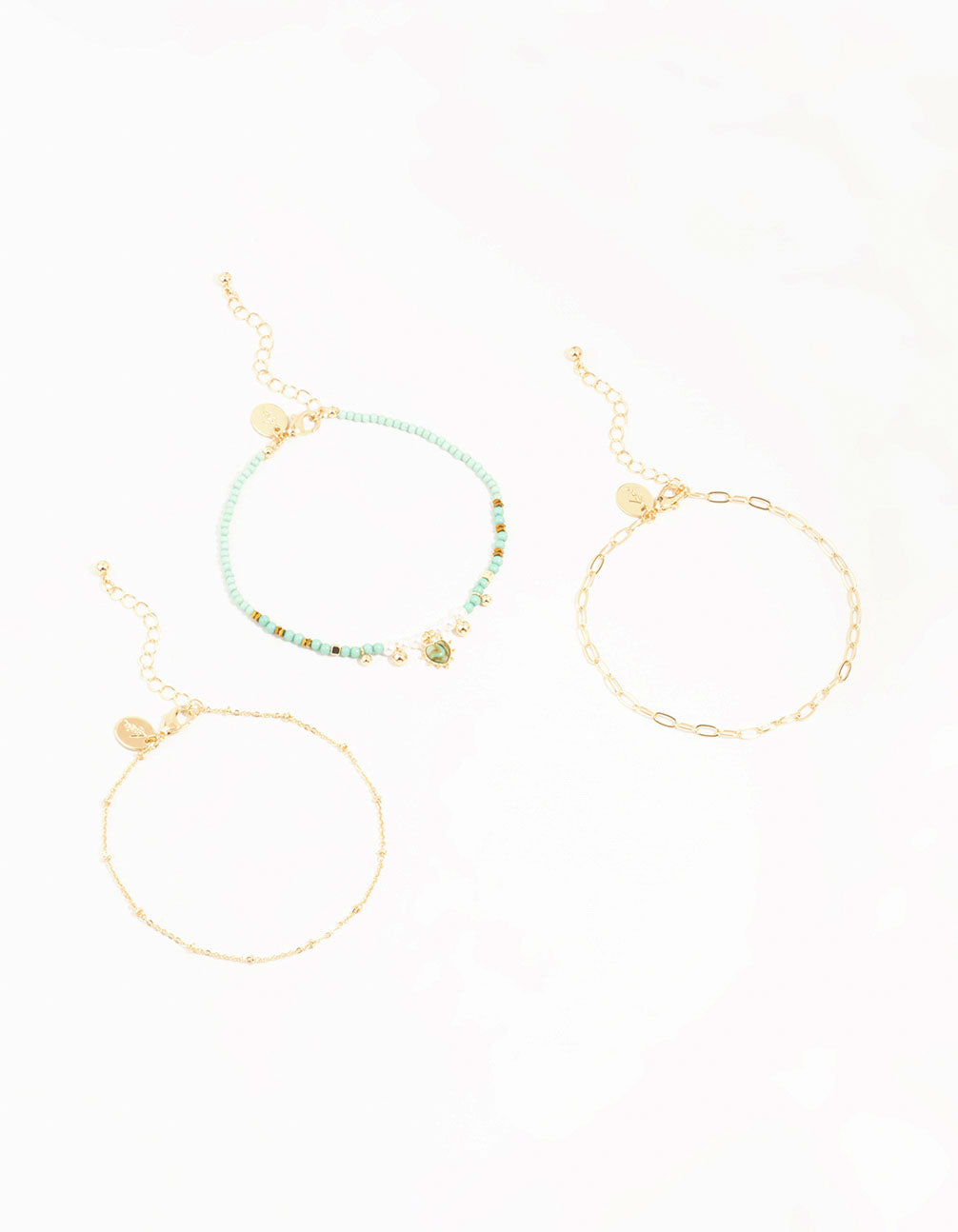 Gold Boho Heart & Mixed Chain Anklets 3-Pack