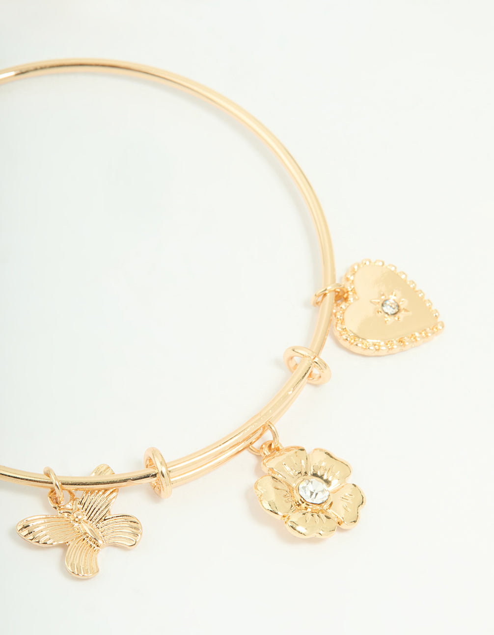 Gold Butterfly Heart & Flower Charm Adjustable Bangle