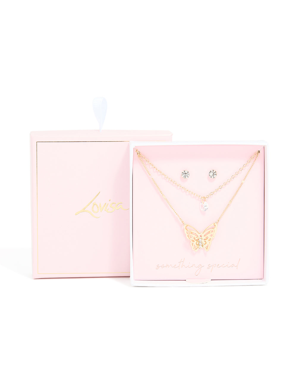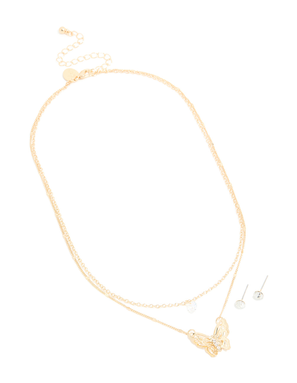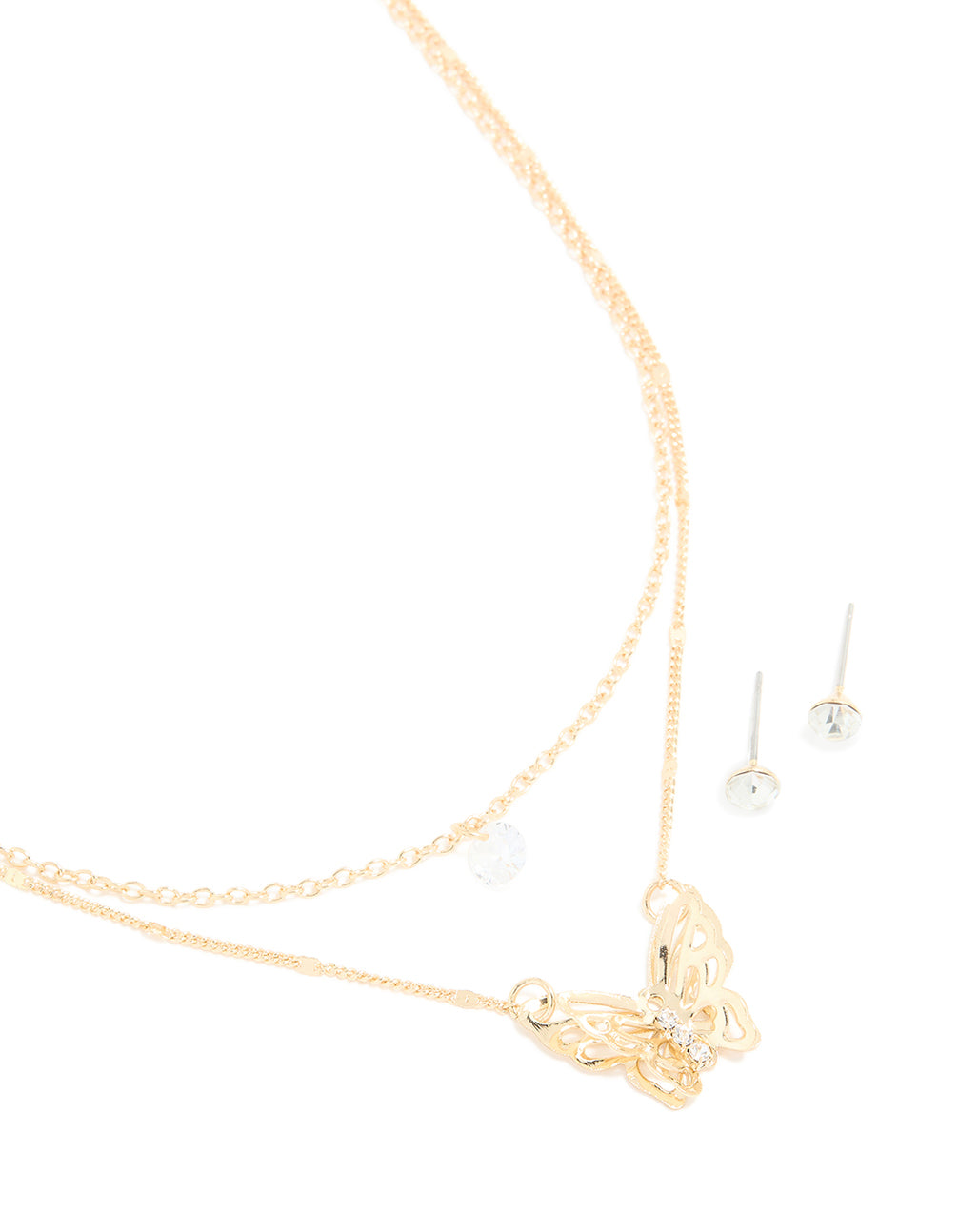 Gold Butterfly Layered Necklace & Stud Earrings Set