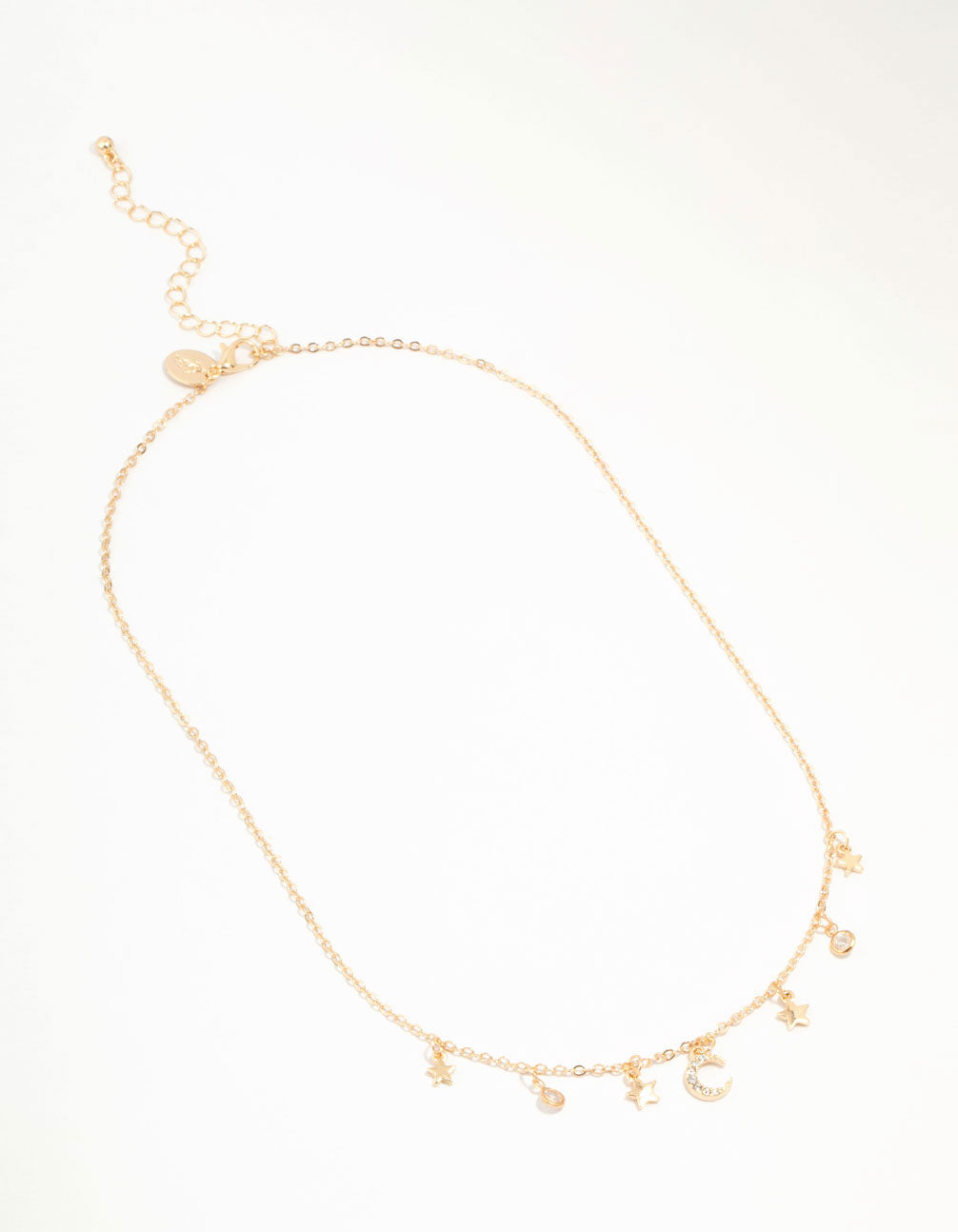 Bring celestial charm to your look with this drop necklace. This necklace features an array of delightful celestial-themed charms such as the moon, sun, and stars and diamante crystals. Perfect for adding an out-of-this-world touch.