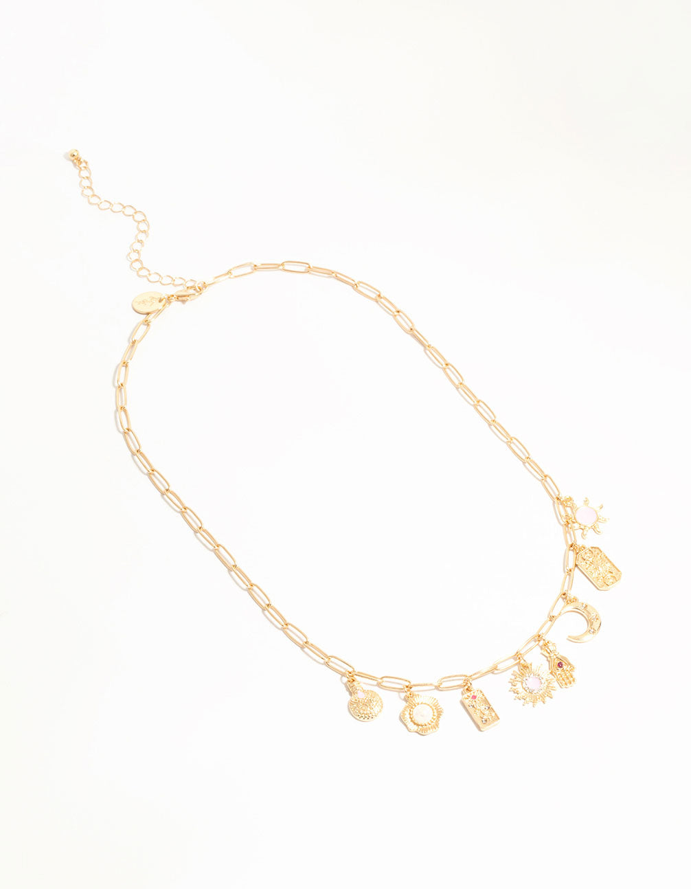Add some cosmic flair to your wrist with this gold-toned charm necklace! Featuring moon, sun, Hamsa hand, and tarot card charms, it's perfect for an ethereal look.