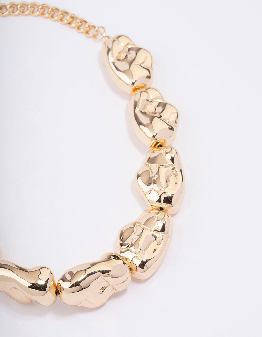 This necklace features a bold chain, adorned with a large, molten textured design for a modern feel.