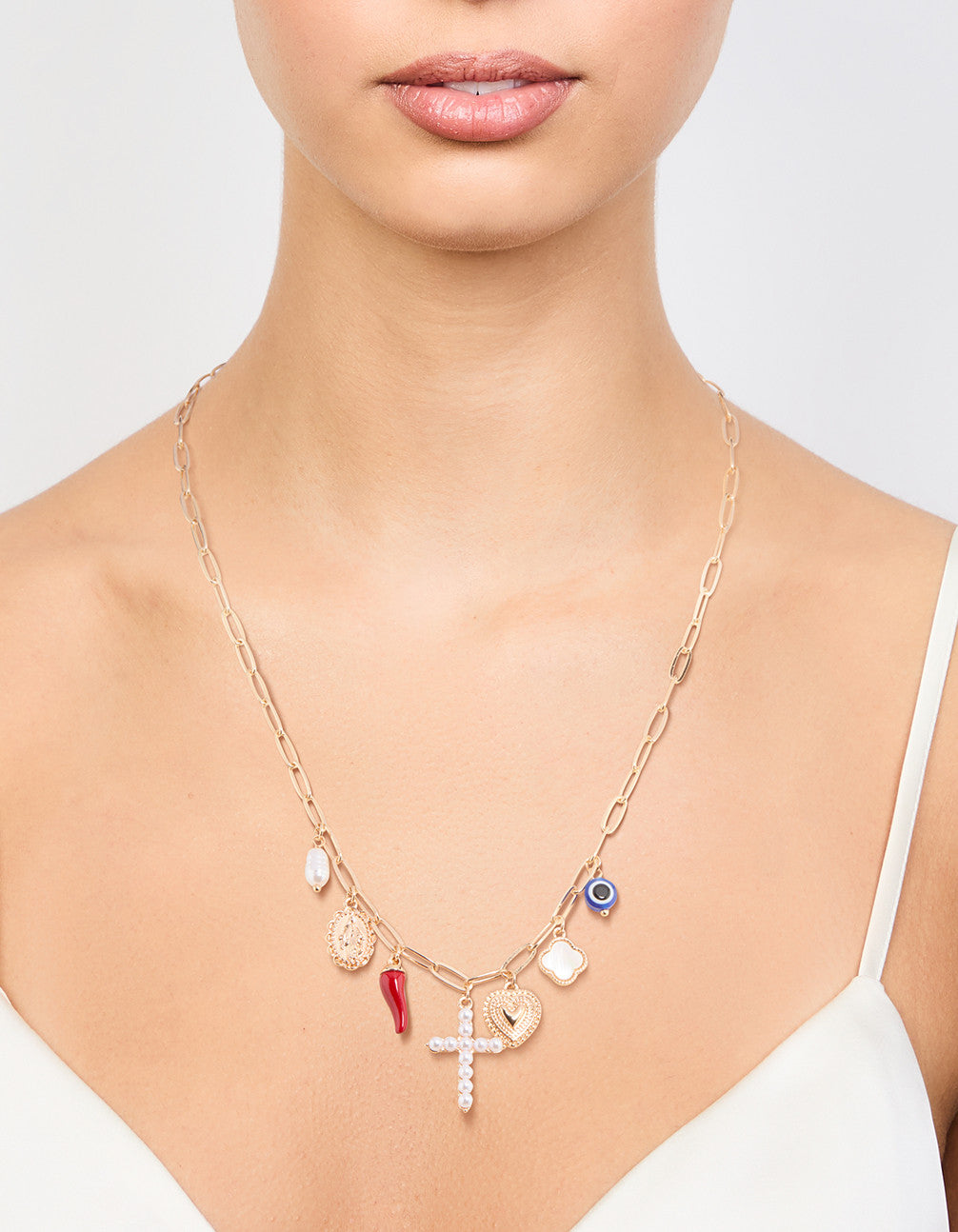Spice up your style with this gold-toned charm necklace! Featuring protective charms like a chilli, evil eye, cross, and heart, it's both stylish and meaningful.