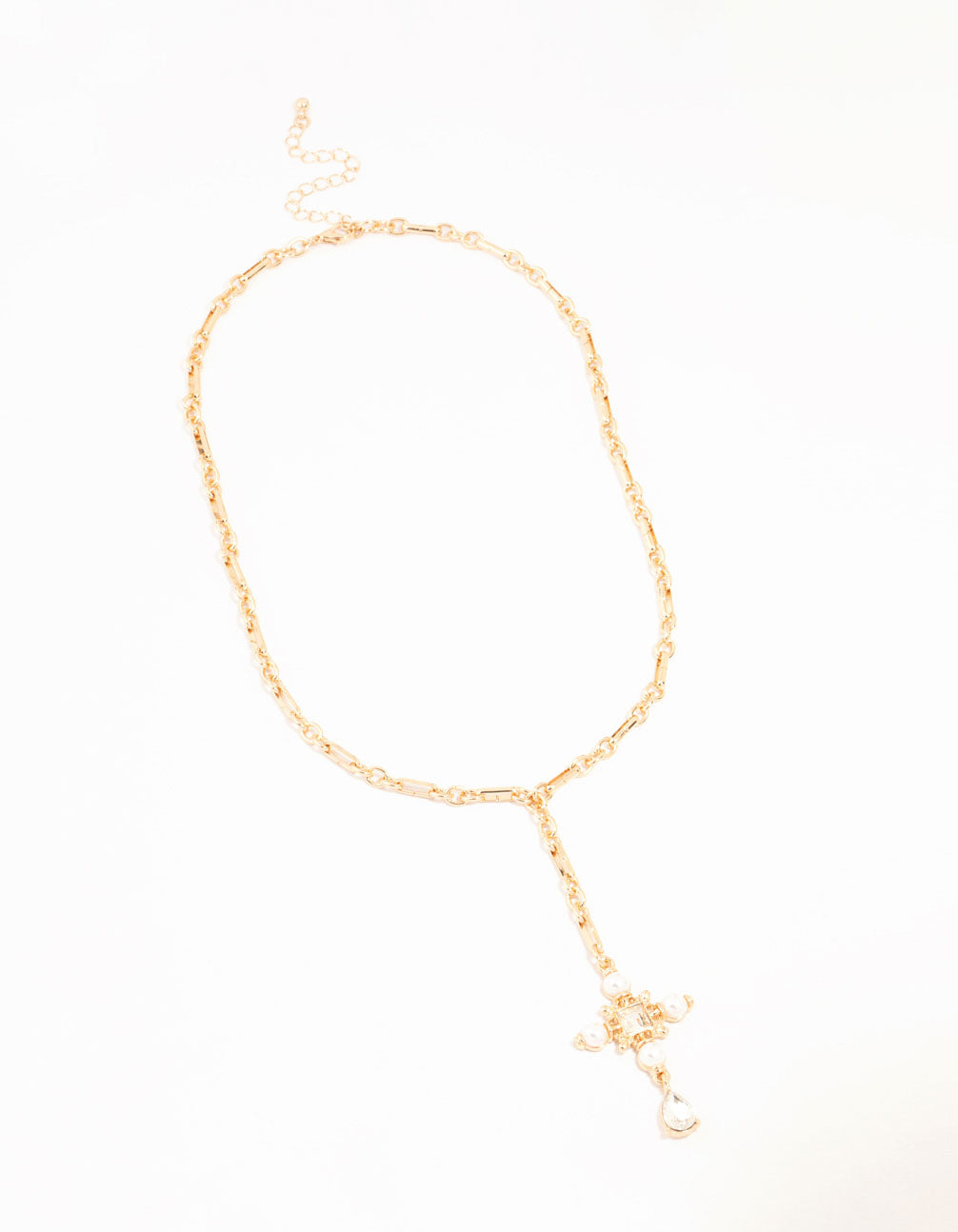 Upgrade your necklace game with this chic y-necklace. Featuring a stylish cross pendant, a gold base, and stunning pearl and diamante detailing, it's the perfect minimalistic piece to add a touch of elegance to any outfit.