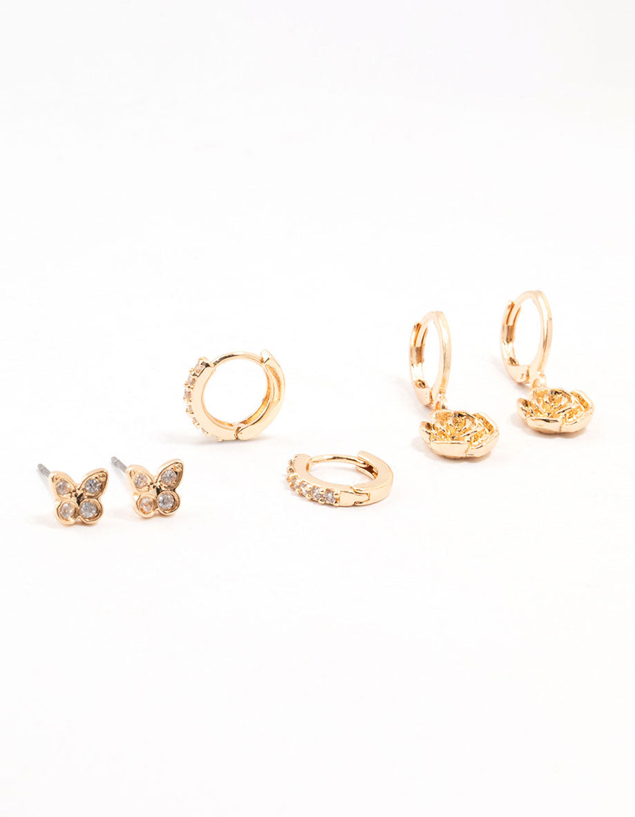 Gold Cubic Zirconia Butterfly & Flower Earrings 3-Pack