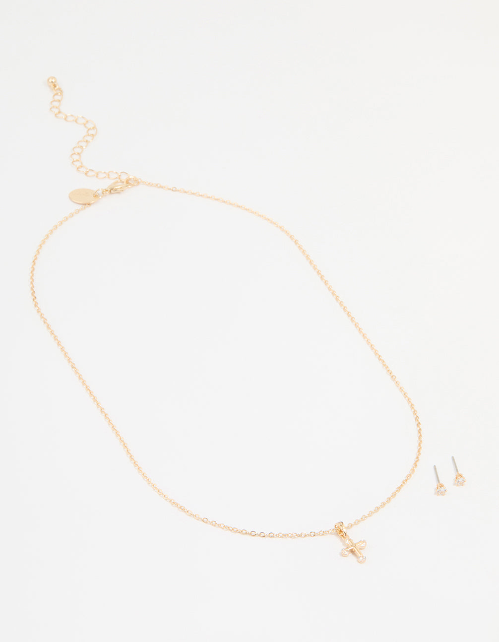 Elevate your style with this Gold Cubic Zirconia Cross Necklace & Earrings Set. Featuring a delicate gold-toned cross pendant necklace and matching stud earrings, this set dazzles with shimmering cubic zirconia crystals for a polished finish. Perfect for gifting, it's a thoughtful way to make someone's day extra special. Whether you're heading to a party, dinner, or just want to add a bit of sparkle to your everyday outfit, this versatile set has you covered. Pair the necklace with a flowing dress for a feminine touch or layer it with other necklaces for a trendy vibe. The earrings add a subtle shimmer that works beautifully with casual or formal attire alike.