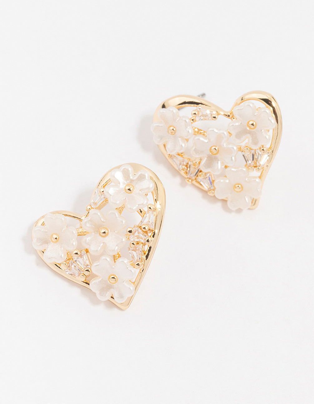 Gold Cubic Zirconia Flower Heart Stud Earrings
