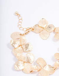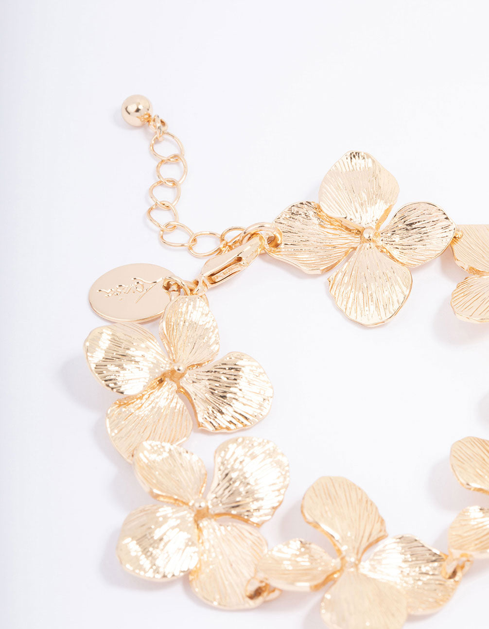 For a decorative addition to your wrist stack, style this golden chain bracelet. This lovely bracelet features a collection of interlocking flowers, designed with intricate detailing and textures for an opulent finish.