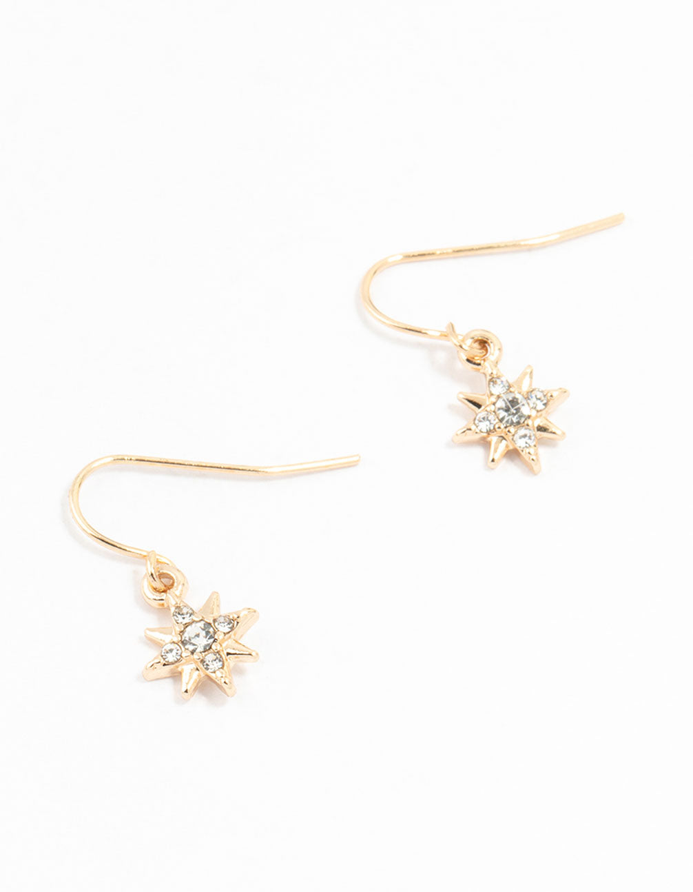 Sparkle with style in these dazzling drop earrings! Crafted from gold, they feature 8-point stars adorned with sparkling diamante crystals. Hanging from slim French wire hooks for a comfortable fit, these glitzy earrings catch the light and turn heads.