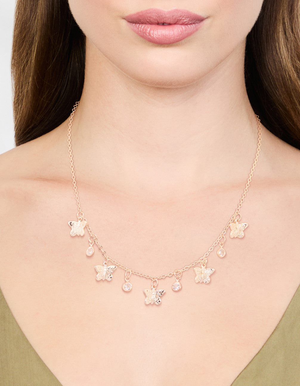 Add some sparkle to your style with this gold toned droplet necklace. This gorgeous gold necklace features a delicate butterfly charms and dazzling cubic zirconia droplets.