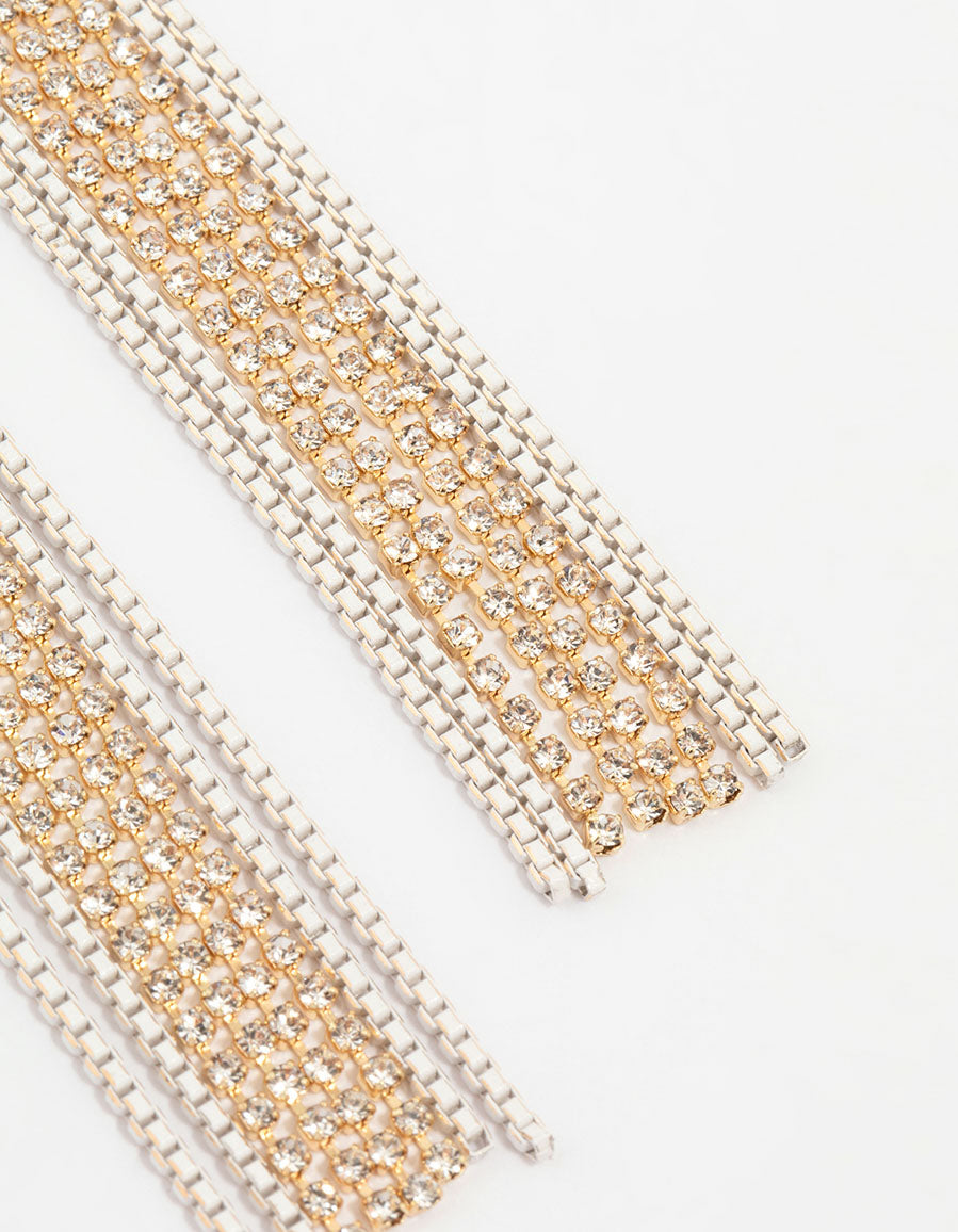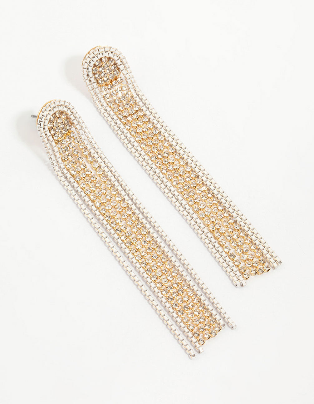 Elevate your earring game with these stunning gold-toned drop earrings! Featuring a gold base, cupchain design, and diamante crystals, they're perfect for a sparkly statement.