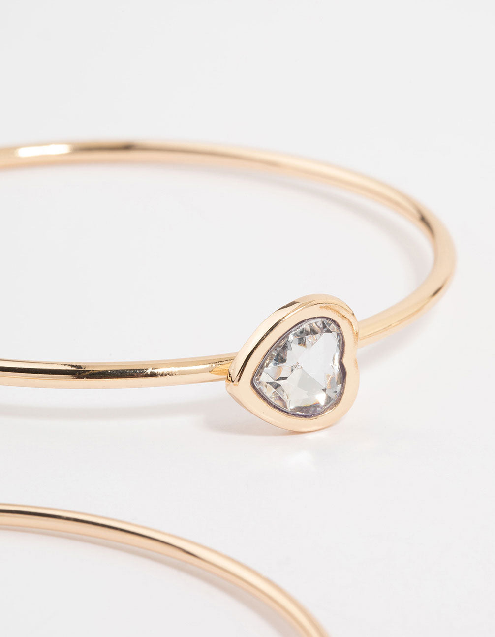Jazz up your wrist game with this dazzling gold bangle set! Featuring three bangles—one with a cute diamante heart and three with sparkling diamante accents—it's the perfect blend of subtle sparkle and chic style.