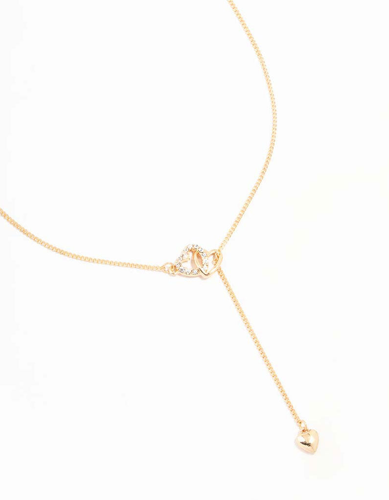 Capture hearts with this gold-toned necklace featuring sparkling diamante heart pendants that dangles elegantly from a delicate Y-chain.