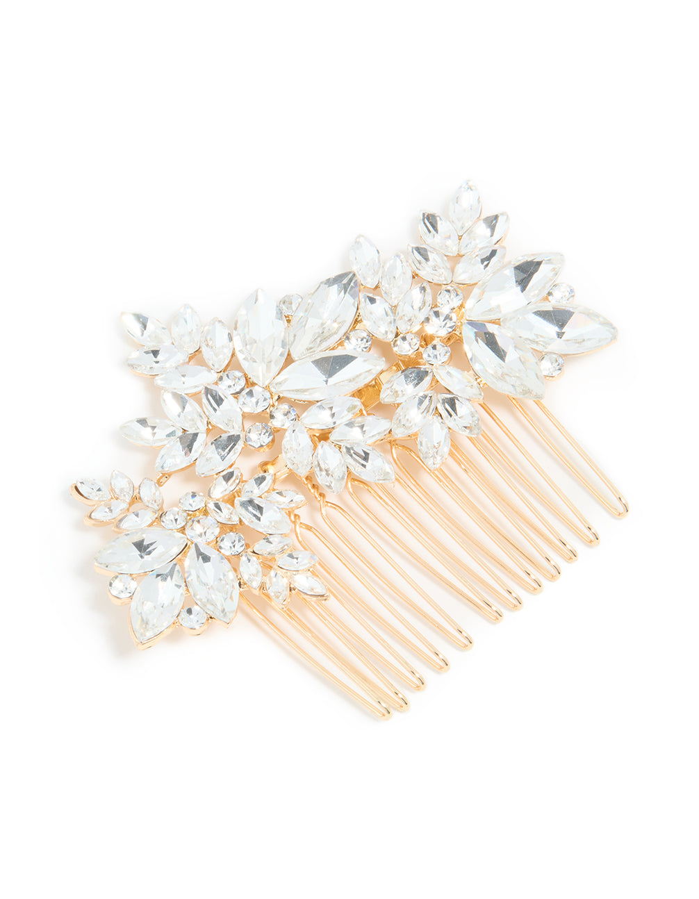 Complete your bridal ensemble with this Gold Diamante Navette Hair Comb. This beautiful hair comb features sparkling navette-shaped diamantes set against a chic gold-tone finish, creating a timeless and radiant look. Perfect for brides, bridesmaids, or anyone looking to add a touch of glamour to their hairstyle, this comb is ideal for updos, half-up styles, or cascading curls. Whether you're walking down the aisle or attending a formal event, this luxurious piece pairs beautifully with flowing dresses, sleek gowns, or tailored jumpsuits. Its intricate design and shimmering details make it a must-have accessory for weddings or any unforgettable celebration.
